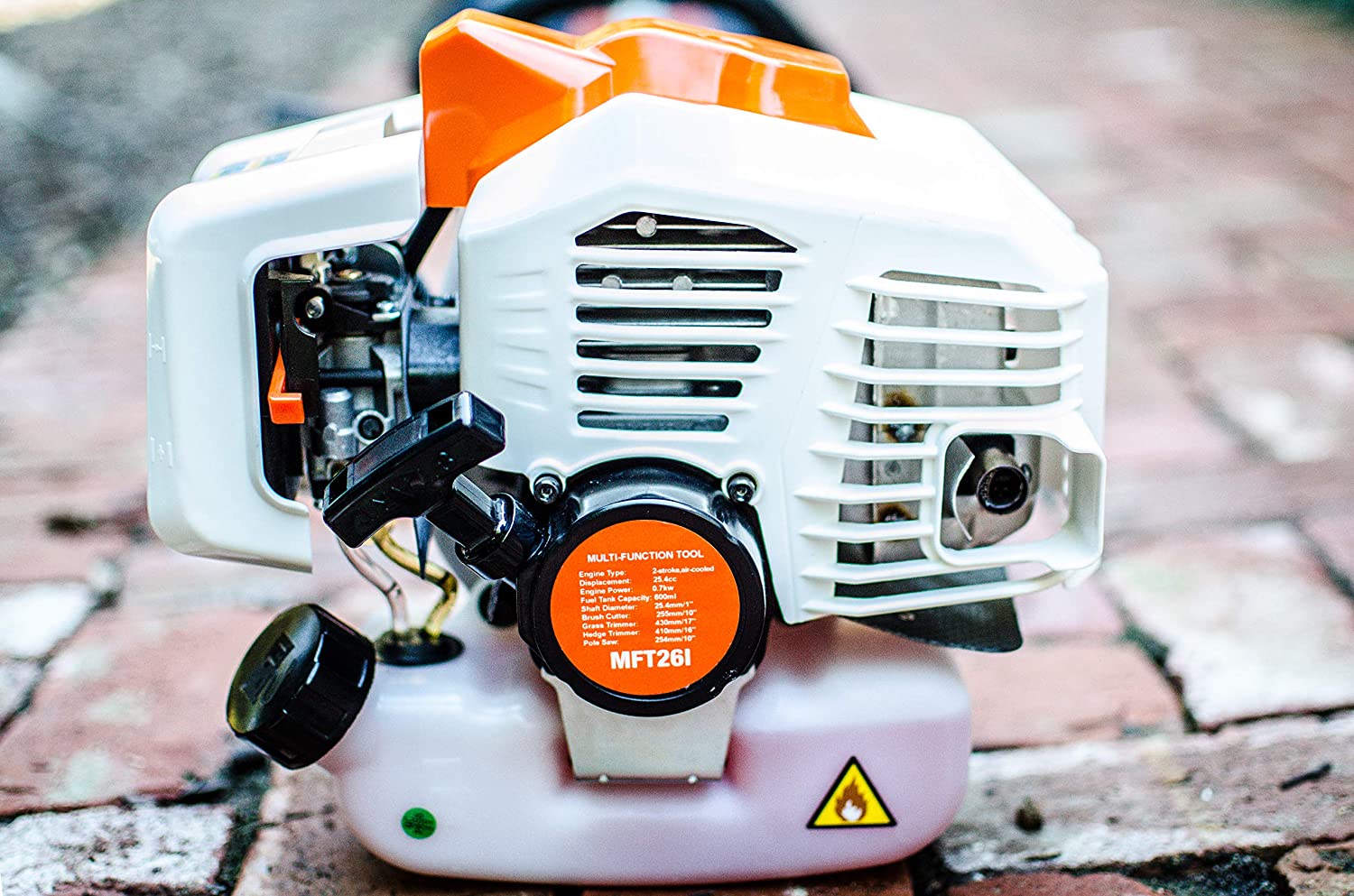 The MFT26 4 in 1 Multi Purpose Tool is powered by a 26cc 2 cycle gas full crank shaft engine. The full crank shaft design reduces emissions, increases fuel efficiency and provides longer life. The starter is designed to pull easily and start quickly. Included in the kit are 4 professional grade attachments. The link-on quick connection allows you to easily convert the tool into a grass trimmer, hedge trimmer, brush cutter or pole saw. This versatility lets you complete most all of your lawn care tasks throughout the year with just one tool. Eliminate the need for four different garden tools and save storage space in your home. Engine transmission is supported by an aluminum support which greatly reduces vibration. Pole saw attachment articulates allowing you to make multiple cuts from different angles. Hedge trimmer attachment is made of high grade steel and rotates to multiple positions allowing you to trim bushes from all angles.