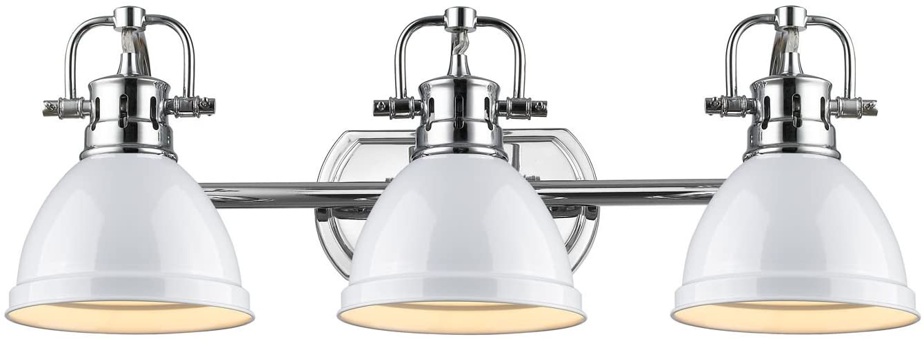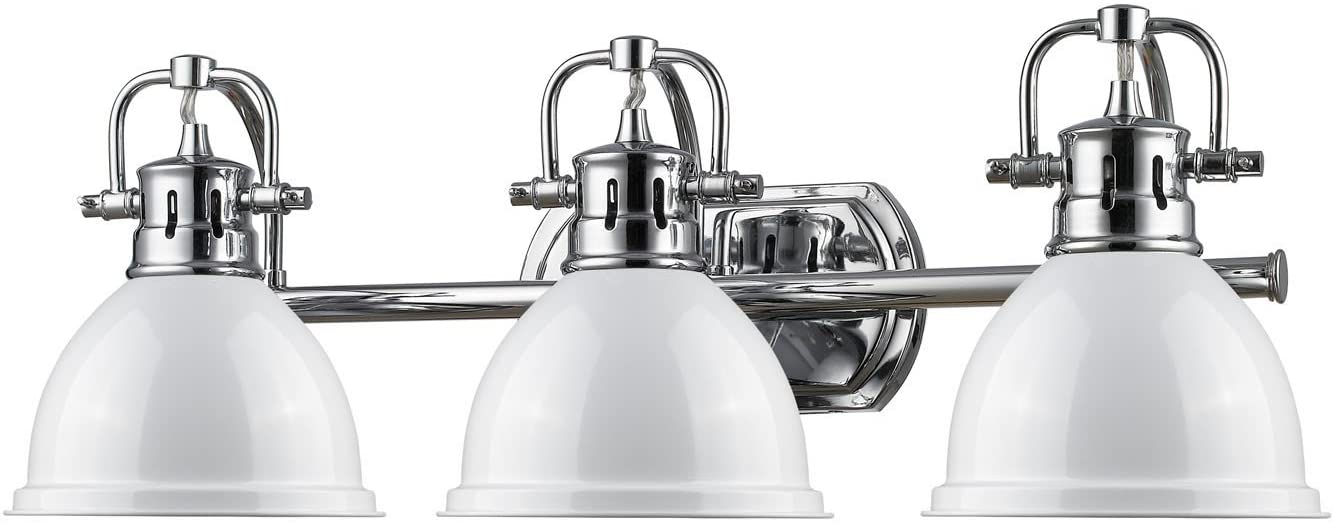 Golden Lighting's Duncan 3 Light Bath Vanity in Aged Brass offers contemporary style with an industrial feel Contemporary style with an industrial feel Simple, classic silhouette Fixture body available in Aged Brass, Rubbed Bronze, Chrome and Pewter Rubbed Bronze fixtures are paired with Rubbed Bronze shades UL listed Damp location for use in bathroom Provides task light over a vanity or mirror All mounting hardware included. Shade Included: TRUE / Number Of Arms: 3 / Room Style: Bath.