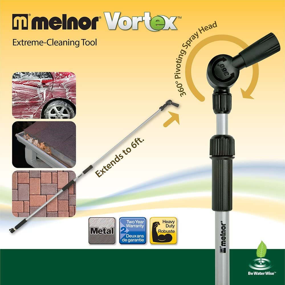 Melnor Vortex extreme cleaning wand blasts away debris from your clogged gutters! This is not a pressure washer, but instead maximize your faucet's water pressure in a flat fan-like spray pattern that acts like a liquid broom. The greater your water pressure (40psi or more), the better the Vortex performs. The wand is fully adjustable in length from 40" out to a maximum of 72". The head rotates a full 360 degrees which makes it easy to clean the hardest to reach locations like behind the garden furniture on your patio or those hard to reach downspouts. This is the ultimate tool for car washing and auto detailing. The Vortex is powerful, but not so powerful that it will damage your car’s paint like a true pressure washer could.