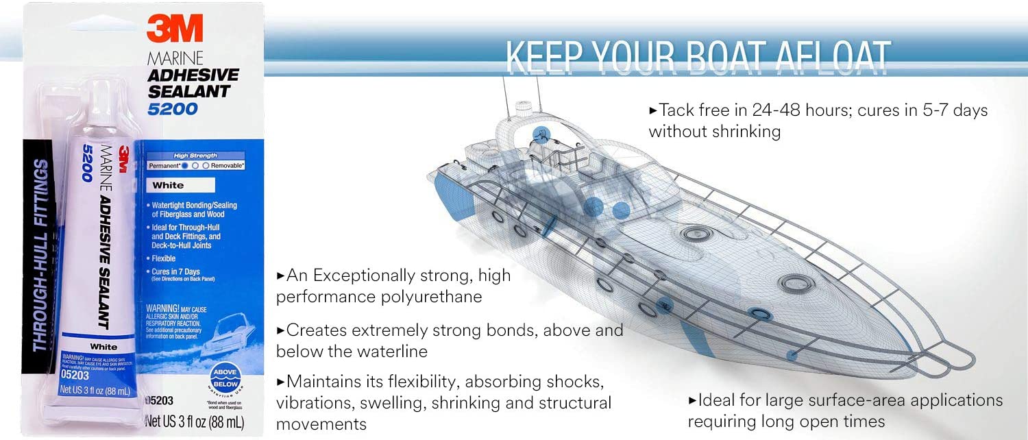 3M Marine Adhesive Sealant 5200 is extremely strong and retains its strength above or below water line. Stays flexible too - allows for structural movement. Has excellent resistance to weathering and salt water.