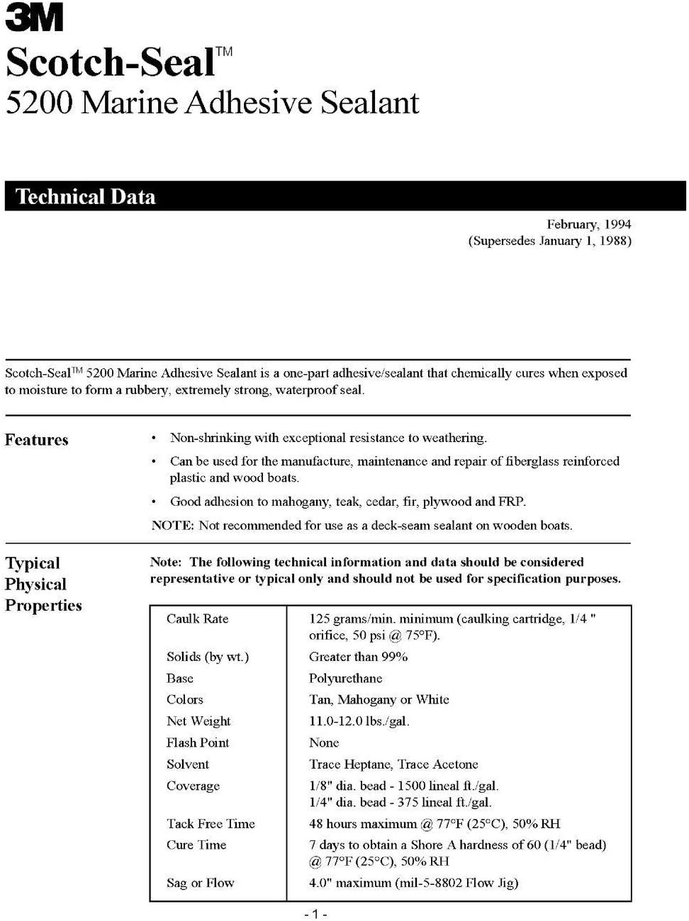 Stress caused by shock, vibration, swelling or shrinking is effectively absorbed. Check the bonding and sealing jobs this product can handle for you: fiberglass deck to fiberglass hull, wood to fiberglass, portholes and deck fittings, motors on fiberglass transoms, under mouldings, hull seams above and below water line. Center board trunk joints. Between struts and planking. Stern joints. Deck housing, etc. Easy to apply with manual caulking gun. Won't sag or flow in vertical or horizontal seams.