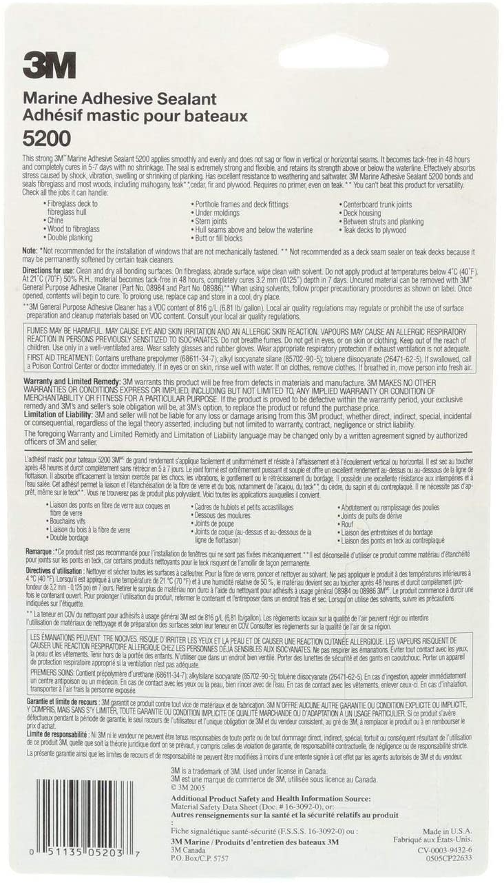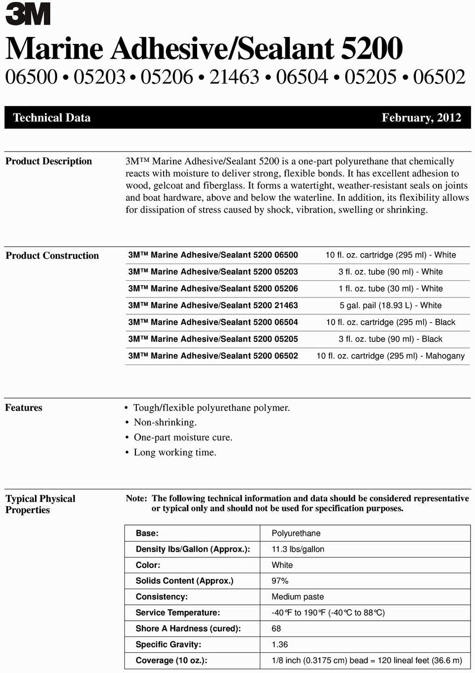 3M Marine Adhesive Sealant 5200 is a tough, flexible polyurethane for permanent bonding and sealing your RV, boat or other watercraft. It is ideal for use on wood, gelcoat, fiberglass, metal and more. It is recommended for interiors, below the waterline and any other places that are shielded from sunlight. It applies right from the container – no mixing is required. It becomes tack-free in 48 hours, and cures to form a firm, flexible, waterproof seal on joints and boat hardware. Far more than a marine caulk, tough, flexible Marine Adhesive 5200 dissipates stress caused by vibration and shock, and won’t crack under dynamic force. It resists saltwater, wind, weather and temperature extremes for long periods of worry-free enjoyment on the water. In fact, for more than 50 years, 3M Marine Adhesive Sealant 5200 has been used and trusted as a marine sealant by professionals in some of the most demanding conditions on earth.