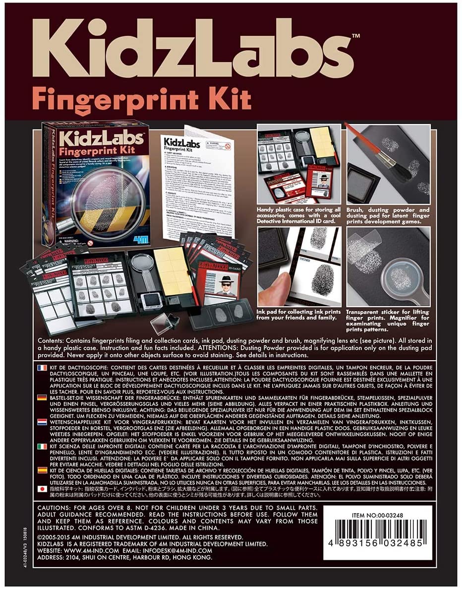 Explore the fascinating science of fingerprint detection with the 4M Fingerprint Kit. Learn how to detect and collect fingerprints just like a forensics expert. The kit contains ten (10) finger print cards, dusting powder, stamp pad, brush and twenty (20) stickers used for collecting finger prints. A sturdy plastic case stores kit items when not in use. Detailed instructions for use and care are included. Recommended for ages 8 years and up.