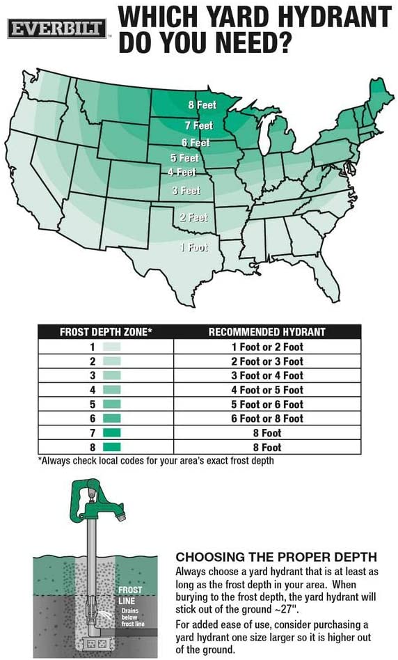 The frost proof yard hydrant has a shut-off valve and operates below the frost line to supply running water. It supplies reliable irrigation water even in the coldest weather. The hydrant has a strong 1 in. galvanized steel stand-pipe and can easily be repaired without digging. Self-draining when handle is in closed position to prevent freezing Heavy duty cast iron head with bucket hook Extra-large cast iron handle for easy operation Brass clevis rod and hose connector Double o-ring sealing system provides a positive seal 1-piece plunger design provides a positive seal and easy adjustment Plunger is easily adjustable with square head set screw Bury depth of 72 in., meaning 27 in. will be above ground Yard hydrant complies with federal lead laws California residents see Prop 65 WARNINGS