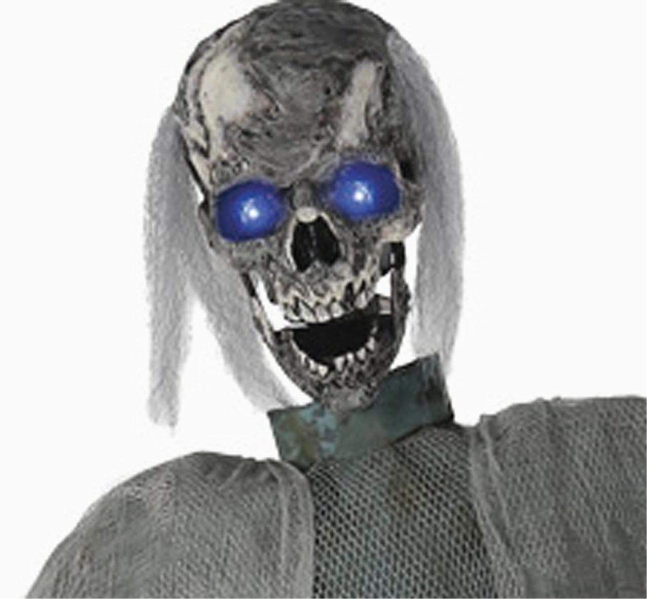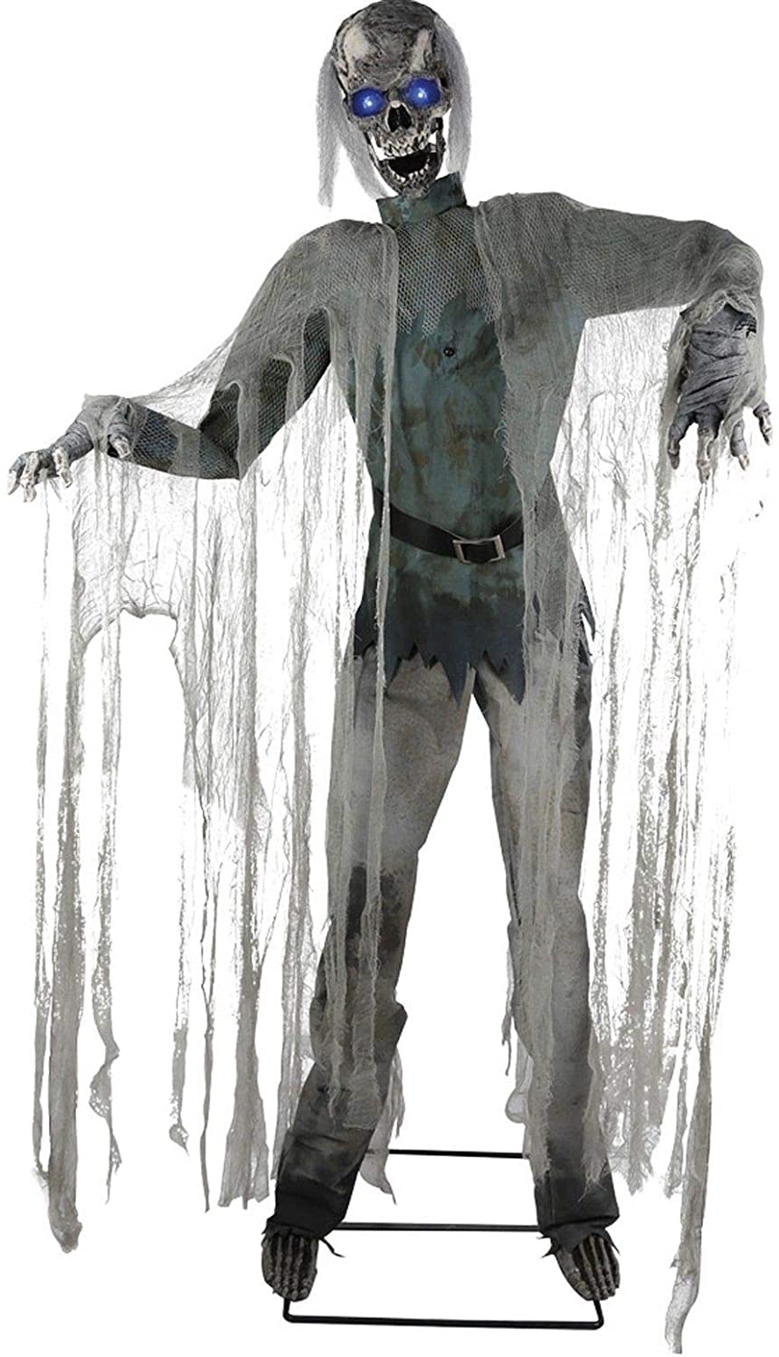 This disgusting 72-inch tall animated Twitching Ghoul looks to have just shambled off a battleground from the middle ages! Wearing a tattered costume with shredded-gauze accents, this rotting Ghoul will rotate at the waist in a jerking motion that will cause his disturbingly-realistic plastic hands, chest, and spring-activated head with a loose jaw to twitch and flop around. His eyes light-up with an other-worldly blue color while he makes disgusting sounds of the undead - truly horrifying! Plug the UL power adapter into any standard outlet and choose from Steady-On, Infra-Red Sensor or Step-Here Pad (included) activation options to operate. The infra-red sensor works up to 6.5 feet away and works in all lighting conditions - bright light to no light! Item includes volume control. Easy-to-assemble quick-connect poles. Assembly is required. For indoor or covered-porch use only.