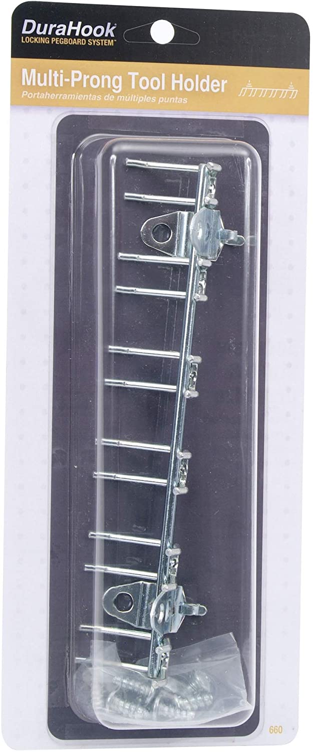 Triton 660 Dura Hook Multi Prong Tool & Wrench Holder Double locking mechanism keeps pegboard hooks and tools in place Will never fall out Loc-Screw is included with each pack Zinc plated steel construction Designed to meet the toughest home, commercial and industrial applications Holds heavy power, hand, and yard tools Mounts in four different positions Member tested and recommended by the Handyman Club of America Multi prong design Fits both 1/8" and 1/4" pegboards 1-13/32' x 8-1/8" Carded. This Product is manufactured in China.