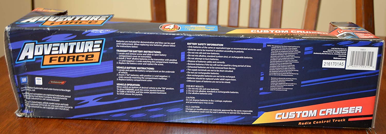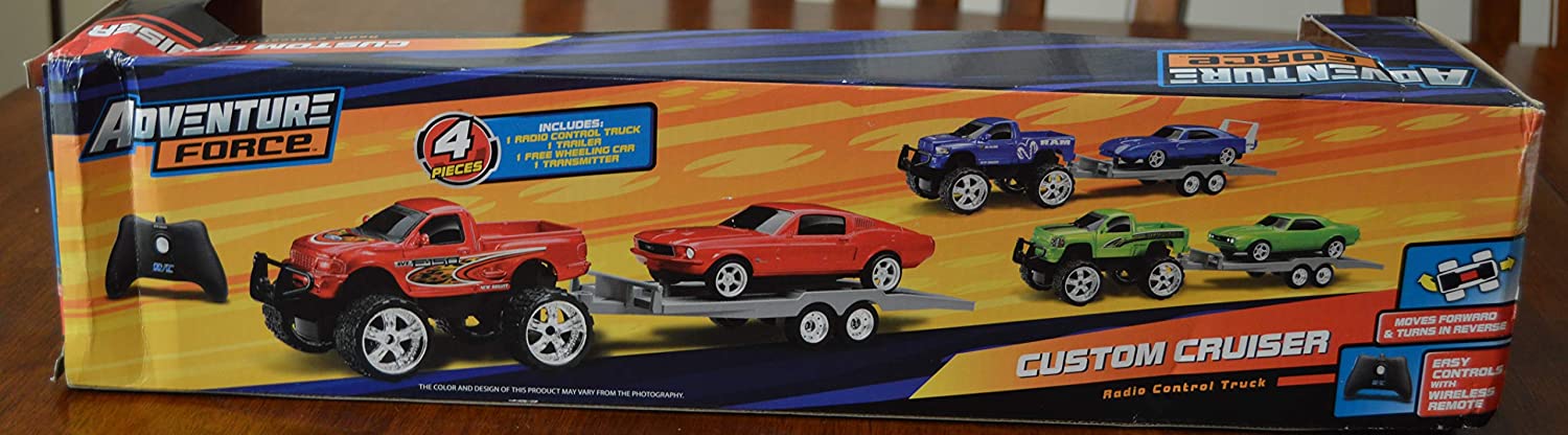 Watch out for your little one coming round the corner in style with this Custom Cruiser Radio Control Truck from Adventure Force! Designed for use by kids ages 4 and up, this fun and dynamic 4-piece Custom Cruiser Radio Control Truck is all your little one needs to have the time of their life driving around the house, either racing to the finish line or just cruising for fun. The cruiser has a super fun design and comes in a bright and vibrant red coloring that's sure to be a big hit with your kid. It has a super realistic design with vehicles that are made to look like an F-150 and '68 Mustang. The full set includes 1 radio control truck, 1 trailer, 1 free-wheeling car, and 1 transmitter. With a generous range and easy controls with a wireless remote, it's a premium radio-controlled vehicle for some high-octane fun! Spend countless hours whipping around the house with the moveable wheels and motorized engine. Get ready to satisfy your need for speed, and pick up this Adventure Force Custom Cruiser Radio Control Truck today!