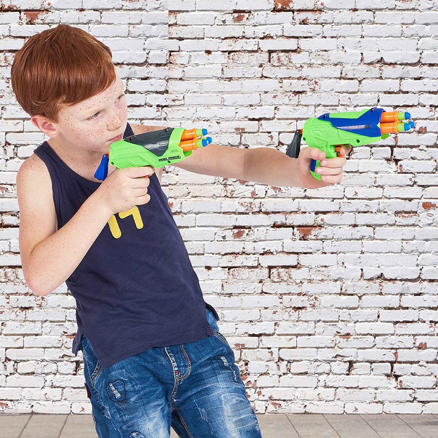 Adventure Force Duel Force contains 2 auto-advancing dart blasters and 6 foam darts. Blasters and darts are compatible with all Adventure Force Blasters and most NERF Blasters. They shoot up to 100 feet.
