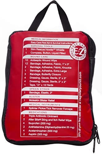 The Adventure First Aid 1.0 by AMK contains supplies to treat cuts & scrapes, sprains, insect bites, headaches, muscle aches, and allergic reactions. AMK's exclusive Easy Care™ First Aid System organizes items by injury with injury-specific instruction cards to help anyone quickly and confidently give first aid.2 Bandage, Adhesive, Fabric, Knuckle.3 - Bandage, Butterfly Closure.2 - Dressing, Gauze, Sterile, 2" x 2", Pkg./2.2 - Dressing, Gauze, Sterile, 3" x 3", Pkg./2.1 - Moleskin, 3" x 4".1 - Bandage, Elastic with Clips, 2".1- Splinter Picker/Tick Remover Forceps.2 - Acetaminophen (500 mg), Pkg./2.2 - After Bite Wipe.2 - Antihistamine (Diphenhydramine 25 mg.1 - Aspirin (325 mg), Pkg./2.2 - Ibuprofen (200 mg), Pkg./2.1 - Compass, Button, Liquid Filled.1 - Mini Rescue Howler Whistle.10 - Antiseptic Wipe.1 - Tape, 1/2" x 10 Yards.2 - Triple Antibiotic Ointment, Single Use.Group Size: 1 - 2 People.Trip Duration: 1 Day.Size: 5" x 6.5" x 1".Weight: 8 oz.. WARNING: This product can expose you to chemicals which is [are] known to the State of California to cause cancer and birth defects or other reproductive harm. For more information go to www.P65Warnings.ca.gov.