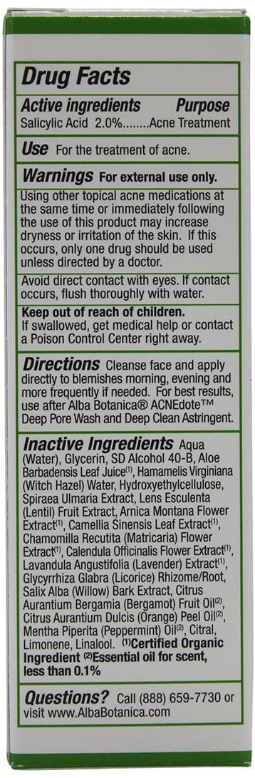 Alba Botanica Natural Acnedote Invisible Treatment Gel, 0.5 Ounce -- 2 pack. Signature ingredient: Willow Bark Extract, a natural source of Salicylic Acid, helps treat and prevent acne. Licorice and Lentil Extracts help neutralize acne-causing bacteria and combat shiny skin. Organic Aloe and Organic Chamomile help soothe and calm inflammation. Product description: Acne-targeting gel delivers clearer skin in just 4 hours.* This powerfully natural, botanically effective, ultra light, non-sticky treatment gel prevents and treats acne, resulting in clearer skin in just 4 hours.* Features and benefits: Maximum strength 2% Salicylic Acid gel digs deep down where zits start to deliver reduced inflammation on contact and clearer skin in just 4 hours.* This clear gel dries quickly and invisibly with no tacky residue. When used over night, 65% of those tested saw clearer skin in the morning.** So now you really can get your beauty sleep! Shelf Life: 999 days 0.5 Ounce