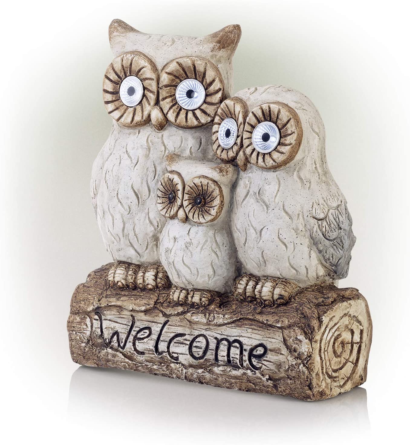 Welcome your house guests with this warm and inviting outdoor statue from Alpine Corporation. The Solar Powered Owl Family "Welcome" Statue with LED Lights features three owls powered by solar energy that provide a unique and charming addition to your home's exterior décor. The statue features an owl family sitting on a log ready to greet your visitors. The lighted yard art is powered by solar energy to keep your outdoor yard statue lit up for up to 8 hours on one full charge and features 2 pairs of LED lights located in the larger owls’ eyes. Constructed from durable magnesia, the yard art is made tough for outdoor use and is weather-resistant for long-lasting, quality use on your porch, patio, or flowerbeds. Add one or multiple statues to create an enchanted garden display. The welcome sign is perfect for display on pathways, entryways, decks, courtyards, and outdoor living spaces. The outdoor garden statue measures 14"L x 8"W x 16"H to fit almost any outdoor space, and includes a one year manufacturer's warranty from date of purchase. Alpine Corporation is one of America's leading designers, importers, and distributors of superior quality home and garden decor products. Alpine's award winning in-house design team continuously develops new and innovative "statements pieces" for your home and garden. Your outdoor living spaces will be the envy of the neighborhood with our wide assortment of fresh, fashionable and contemporary products, from beautifully crafted solar garden stakes featuring patented motion and fiber optic lighting technology to gorgeous glass and glow-in-the-dark birdbaths and feeders.