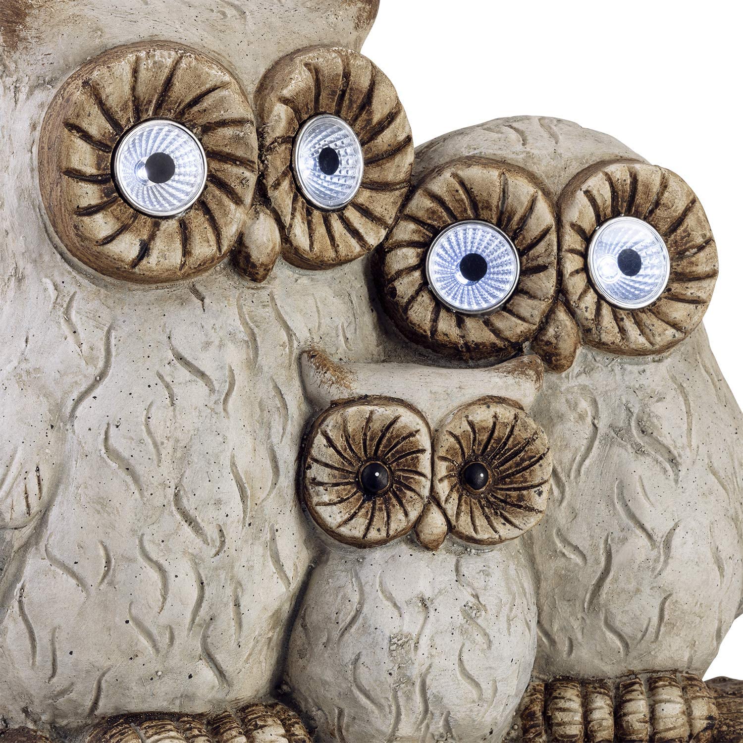 • ILLUMINATE YOUR OUTDOOR AREA: Features an LED light in each eye of the larger owls powered by solar energy to keep your outdoor yard statue lit up for up to 8 hours on one full charge