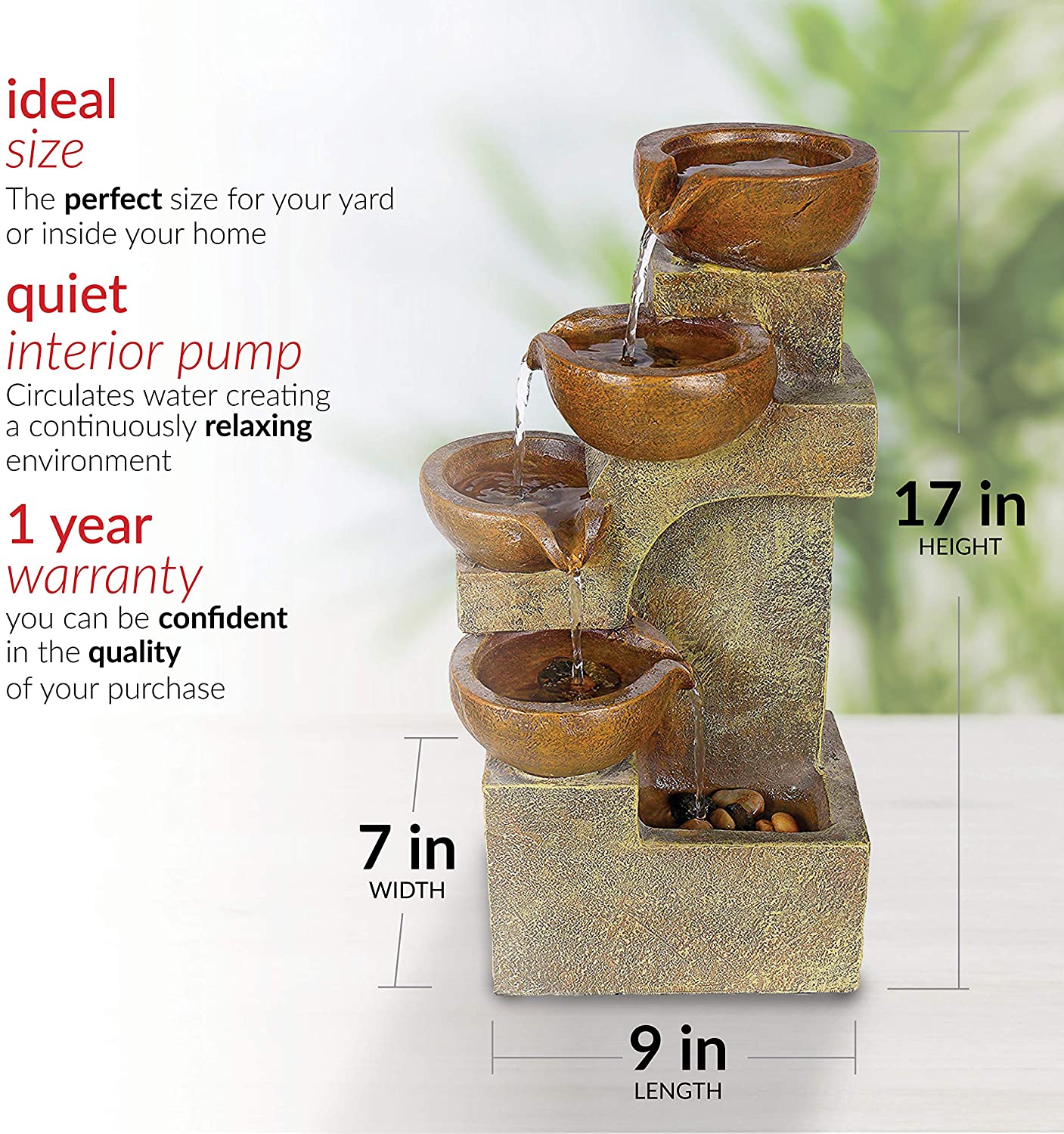 • IDEAL SIZE: Water fountain measures 9"L x 7"W x 16"H, the perfect size for your yard, and includes a one-year manufacturer's warranty from date of purchase