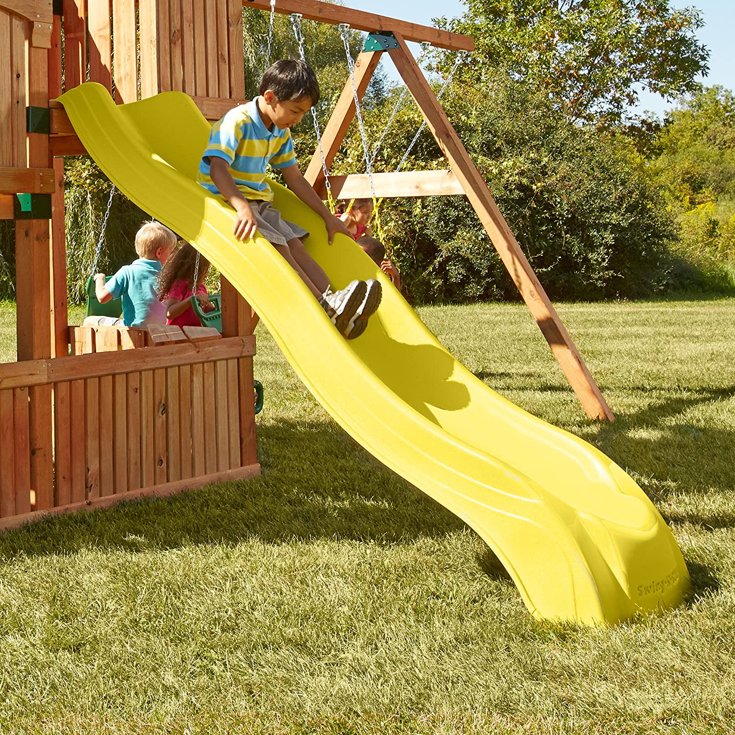 The yellow Alpine Wave Slide features a unique "scoop and wave" for fast action fun! Mounts to 4' 6" - 5' platforms. Dimensions are 104.25L x 24.25W x 11.5H.