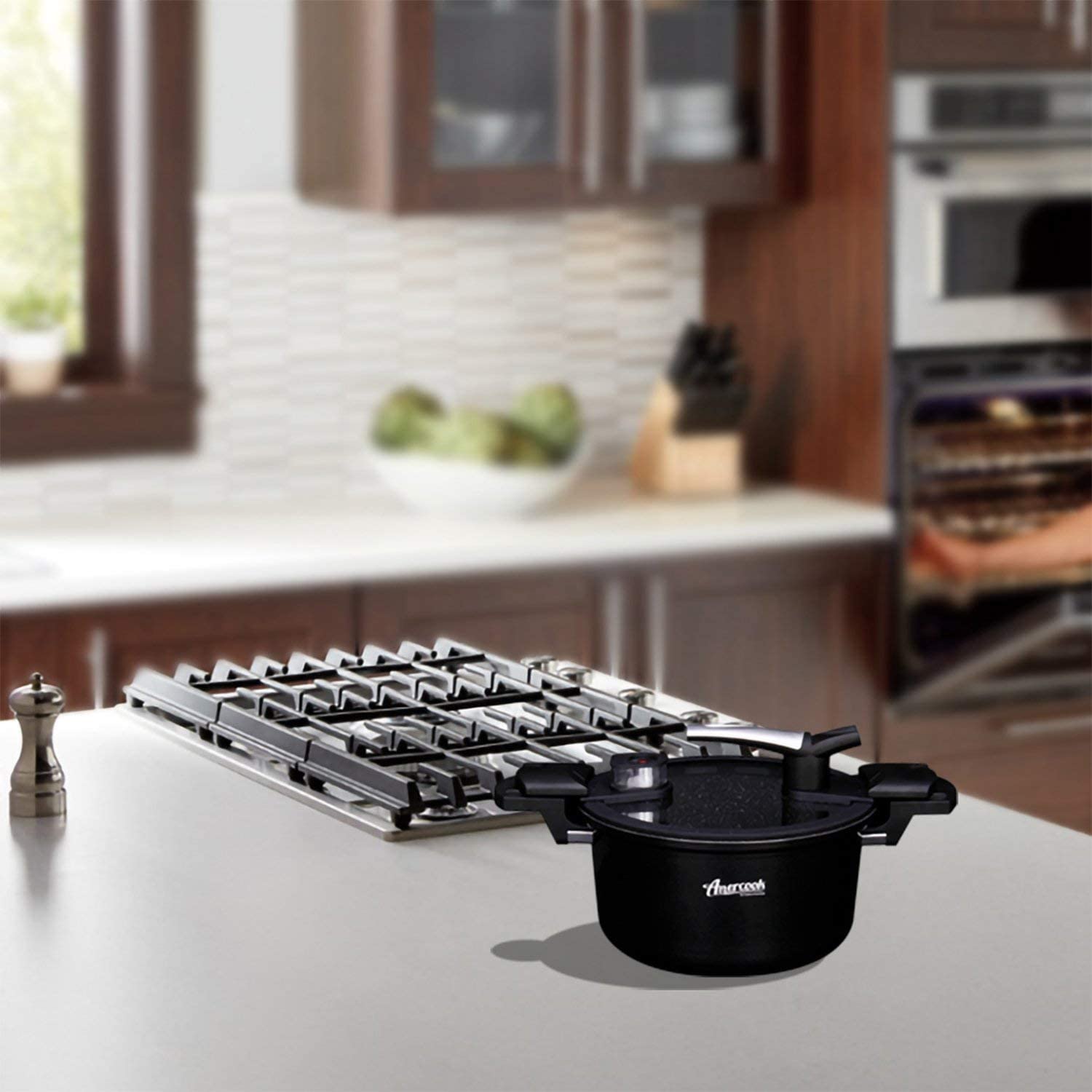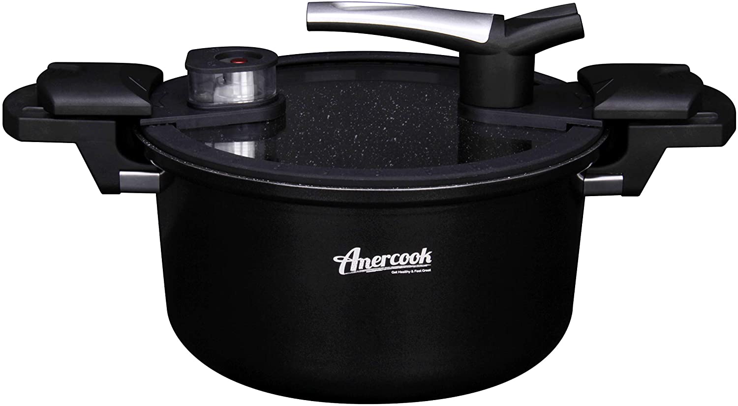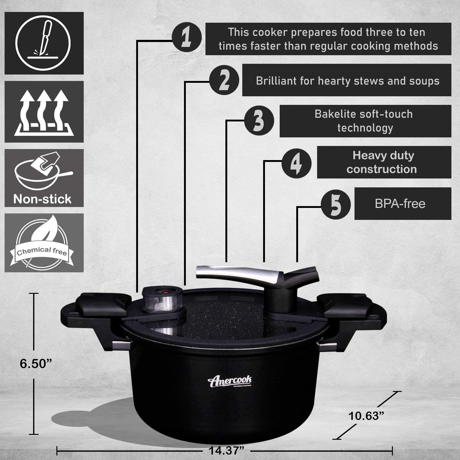 10-inch low-pressure cooker : ergonomic design with bakelite side handles that remain cool to the touch. The inner construction is pressed aluminum , with a nonstick coating inside the pot. Aluminum construction makes for a lightweight product compared to cast iron and other metals, making this cookware less of a strain on hands, arms and wrists. What’s more, aluminum’s energy efficient properties make it ideal for cookware. The metal ensures even heat distribution while the nonstick interior makes cleaning up simple and easy. BPA free, and suitable for all hobs and ranges, including induction heating . Hand wash: dishwasher use not recommended. This product comes with a 2-year manufacturer warranty.
