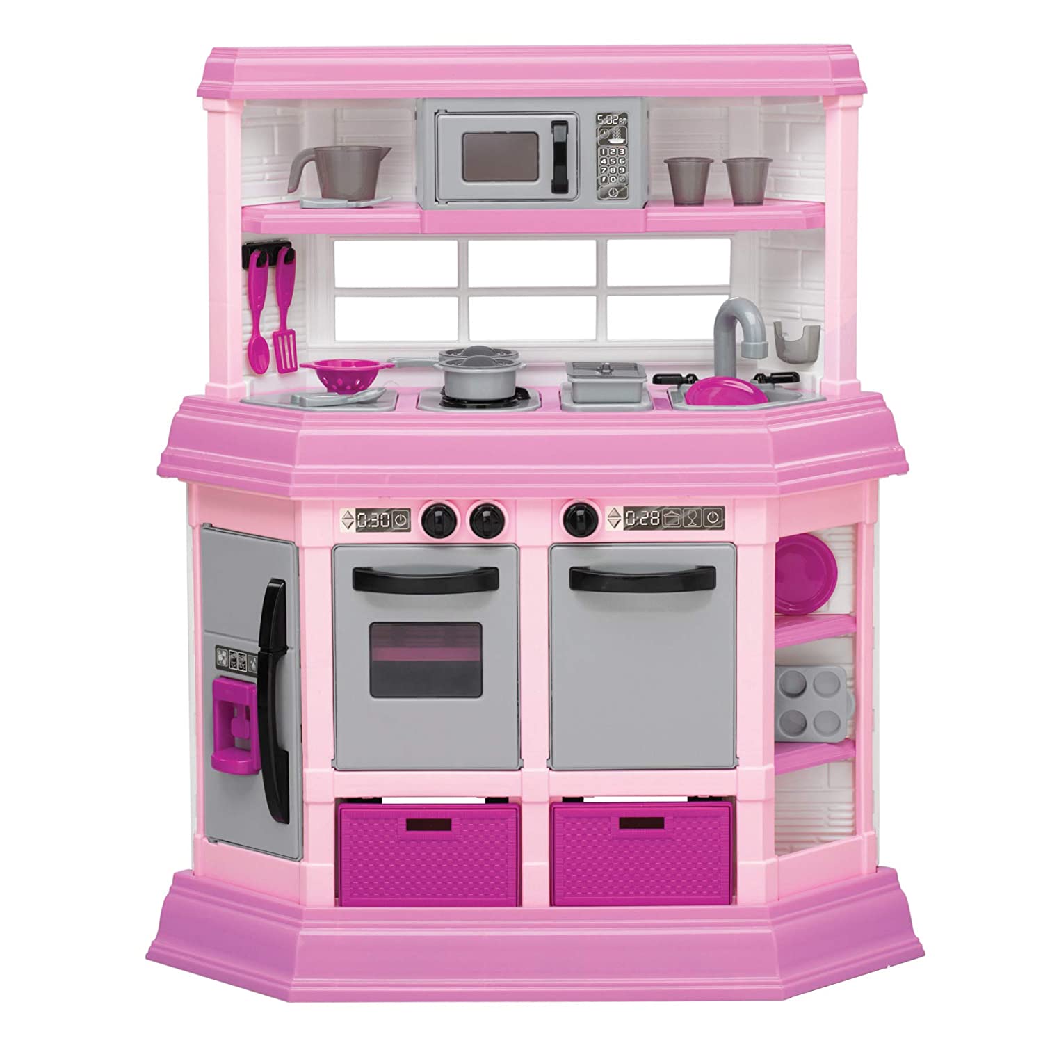 American Plastic Toy’s Custom Kitchen is a colorful kitchen playset that your little chef will love! Featuring realistic burners with light and sound this play kitchen also includes all the great appliances that are found in a real kitchen! Each set includes a microwave; refrigerator, oven, and dishwasher that will keep your child entertain while they prepare meals for their guests. Each chef can get “cooking” by placing pots or pans on the burners to activate lights with lifelike sizzling and bubbling sounds. Each purchase includes 22 play accessories and requires two AA batteries, not included. This is a 2 player game.