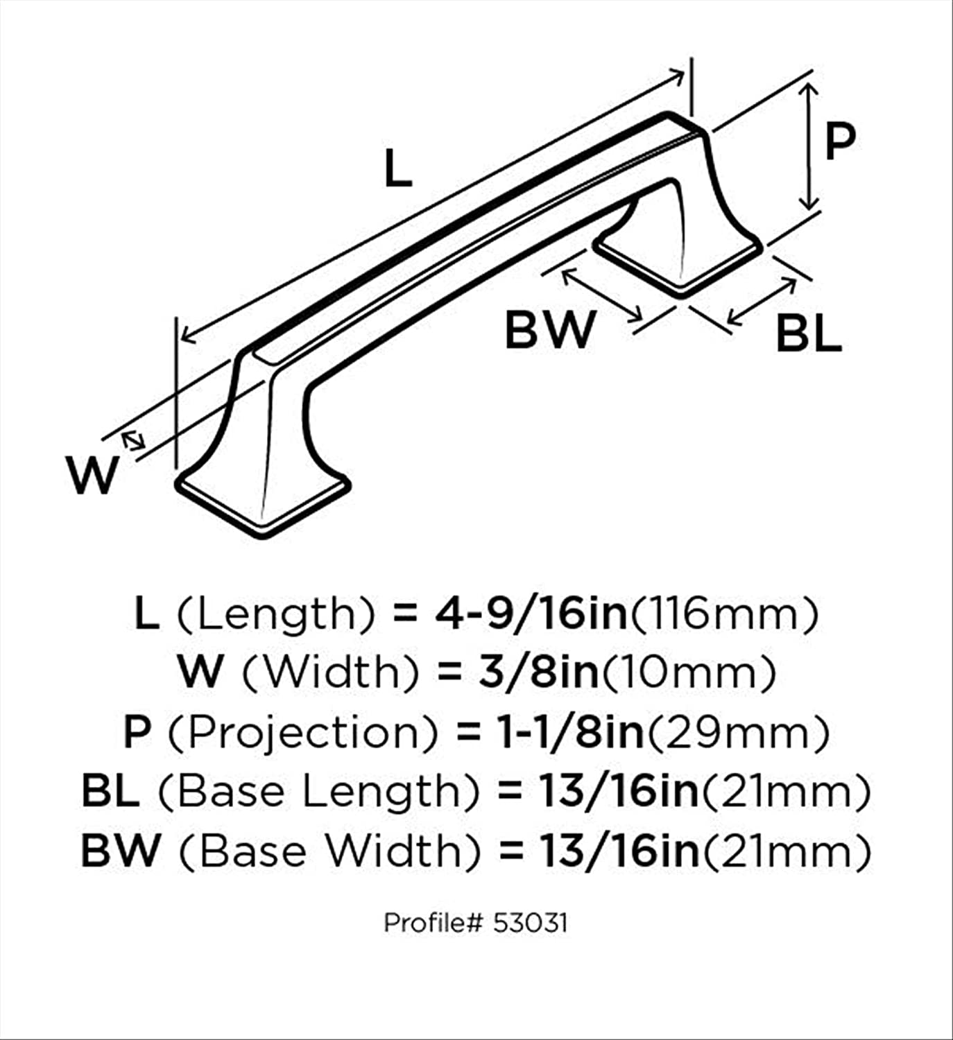 The Amerock BP53031BBR Mulholland 3-3/4 in (96 mm) Center-to-Center Pull is finished in Black Bronze. Elegantly designed with an inviting blend of sophisticated lines, soft curves and warm tones, the traditional style of Mullholland is a timeless classic. Black Bronze is a warm and slightly textured dark finish which nods to the softer side of Black without losing the richness of the Bronze feel. Amerock offers a complete line of decorative and functional cabinet hardware, bath hardware, hook and rail and wall plates. Amerock’s award-winning decorative and functional hardware solutions have built the company’s reputation for chic design accessories that inspire homeowners to express their personal style. Available in a variety of finishes and styles, Amerock offers high quality designs at affordable prices. Always Creating. Always Timeless. Always Amerock.