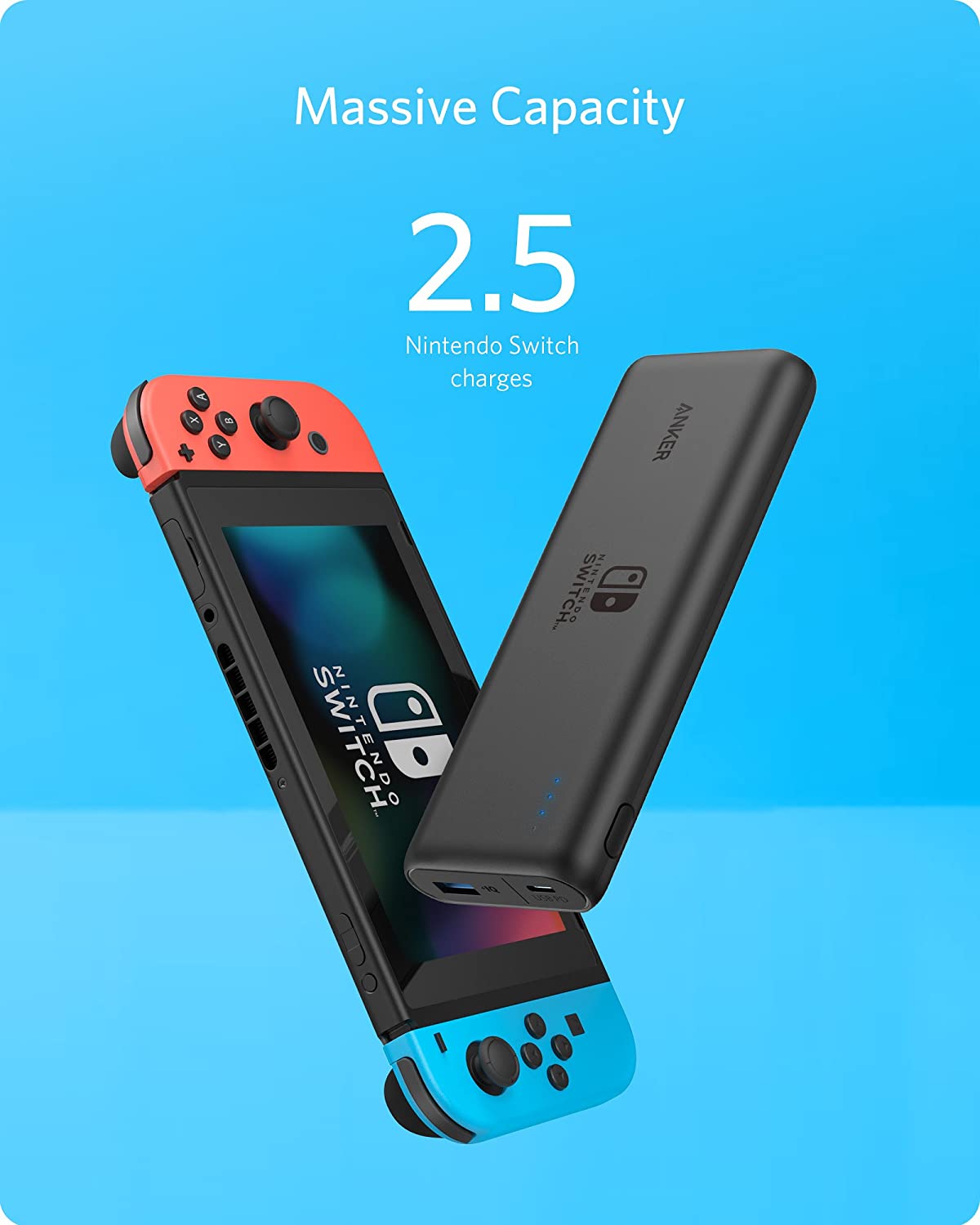 PowerCore 20100 Nintendo Switch Edition The Official High-Speed Portable Charger for Nintendo Switch From Anker, America's Leading Charging Brand • Faster and safer charging with our advanced technology • 30 million+ happy users (a high score!) and counting Powered by Nintendo The official portable charger certified by Nintendo for flawless compatibility and high-speed performance with Nintendo Switch. Power Up Grant Nintendo Switch 2.5 extra lives, give 6 full charges to an iPhone 8, or deliver over 1.3 charges to a MacBook. You'll realize just how portable your devices can be. Power, Delivered Resurrect your Nintendo Switch and respawn in a blazing-fast 31/2 hours. Power Delivery is also designed for use with newer smartphones and laptops, to provide your entire range of equipment with the fastest possible charge. Portable Power A compact built with easy-grip contoured edges make PowerCore the perfect travel partner for Nintendo Switch. Built to slip easily into pack, palm, or pocket, taking your game further has never been easier. Specs Capacity: 20100mAh / 72.36Wh PD USB-C Input: 5V=3A, 9V=3A, 15V=2A, 20V=1.5A PD USB-C Output: 5V=3A, 9V=2.6A, 15V=1.6A Standard USB-A Output: 5V=2A Size: 6.6x2.4x0.9 in Weight: 12.7oz Notes To recharge at full-speed, PowerCore 20100 Nintendo Switch Edition requires a Power Delivery wall charger (not included). PowerCore recharges at full speed with the Nintendo Switch proprietary charger.