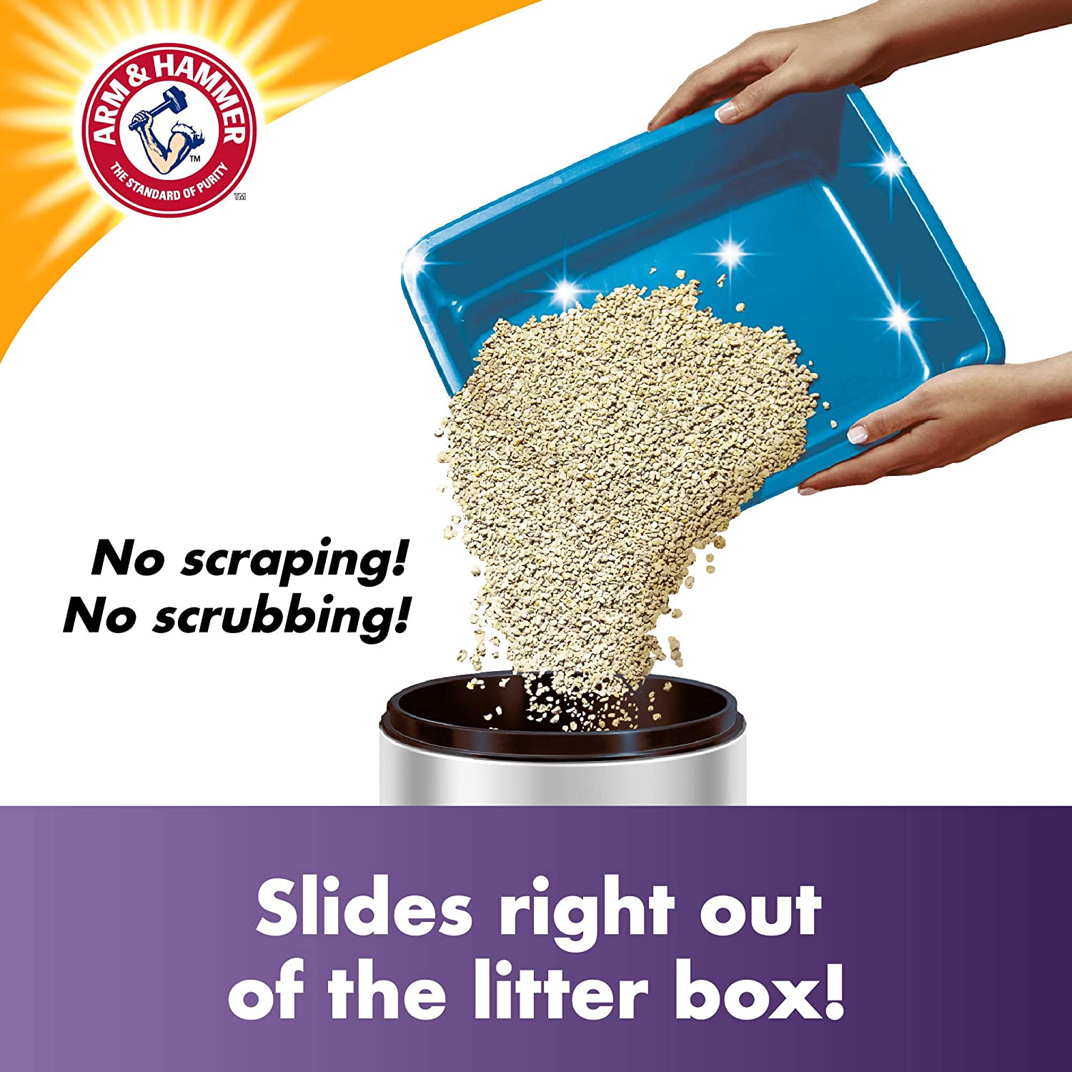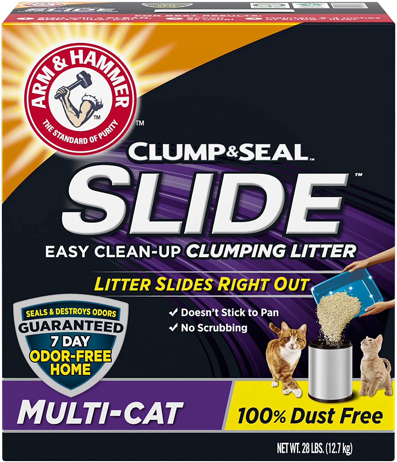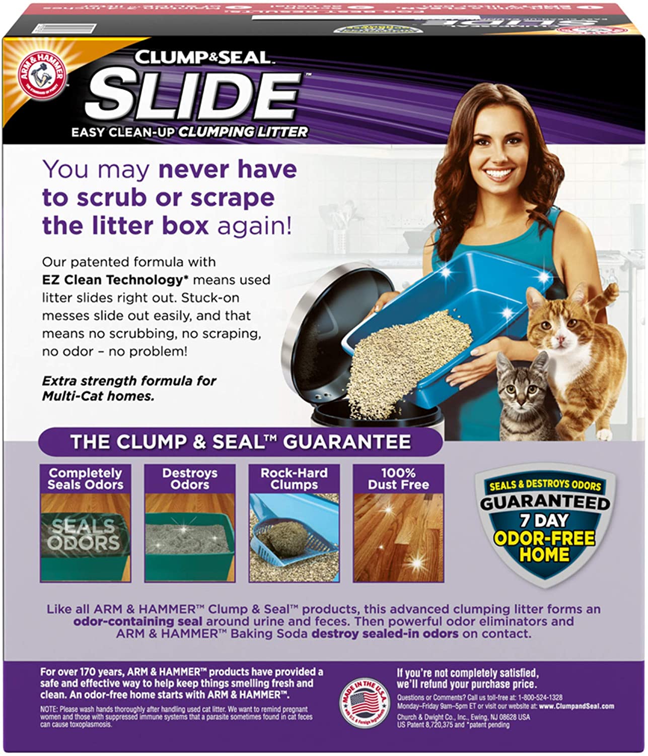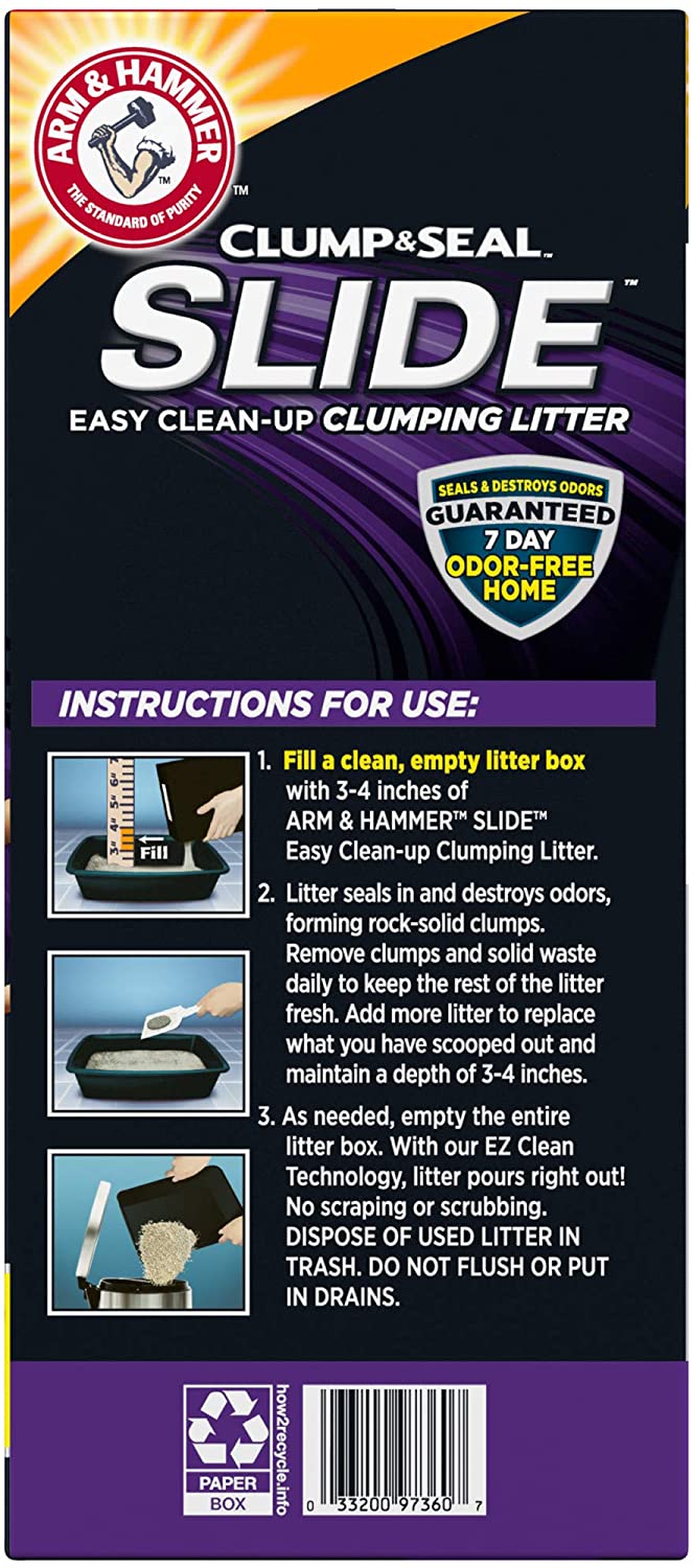 It’s time to end scraping and scrubbing with Arm & Hammer SLIDE Easy Clean-Up Clumping Litter. Our revolutionary formula means the litter slides right out of the litter box, making cleanup easy. Plus, Clump & Seal technology seals and destroys odor for a 7-Day Odor-Free Home, Guaranteed. Fellow cat lovers like you put their trust in ARM & HAMMER. Join them and see how quick and easy clean-up can be!