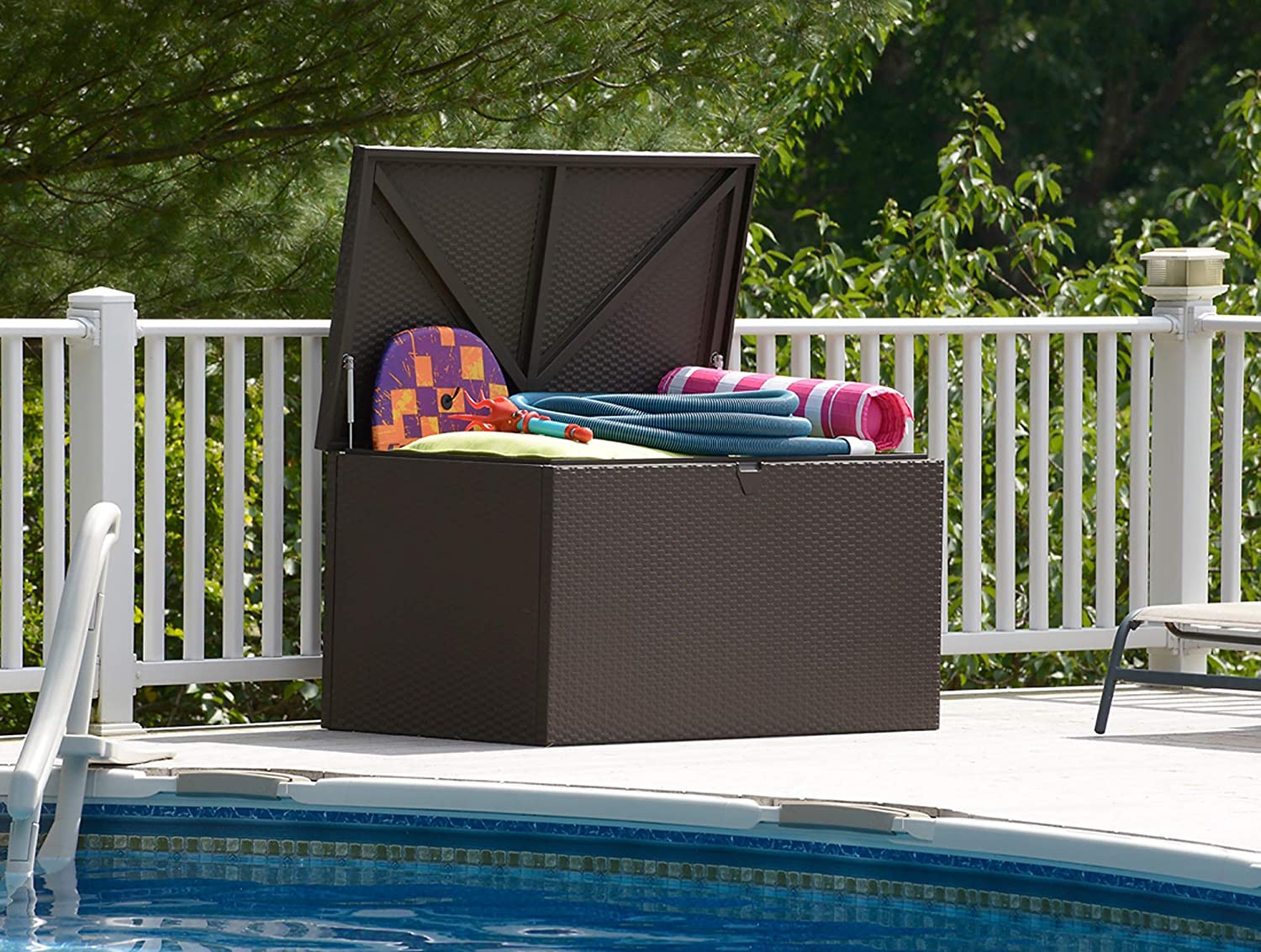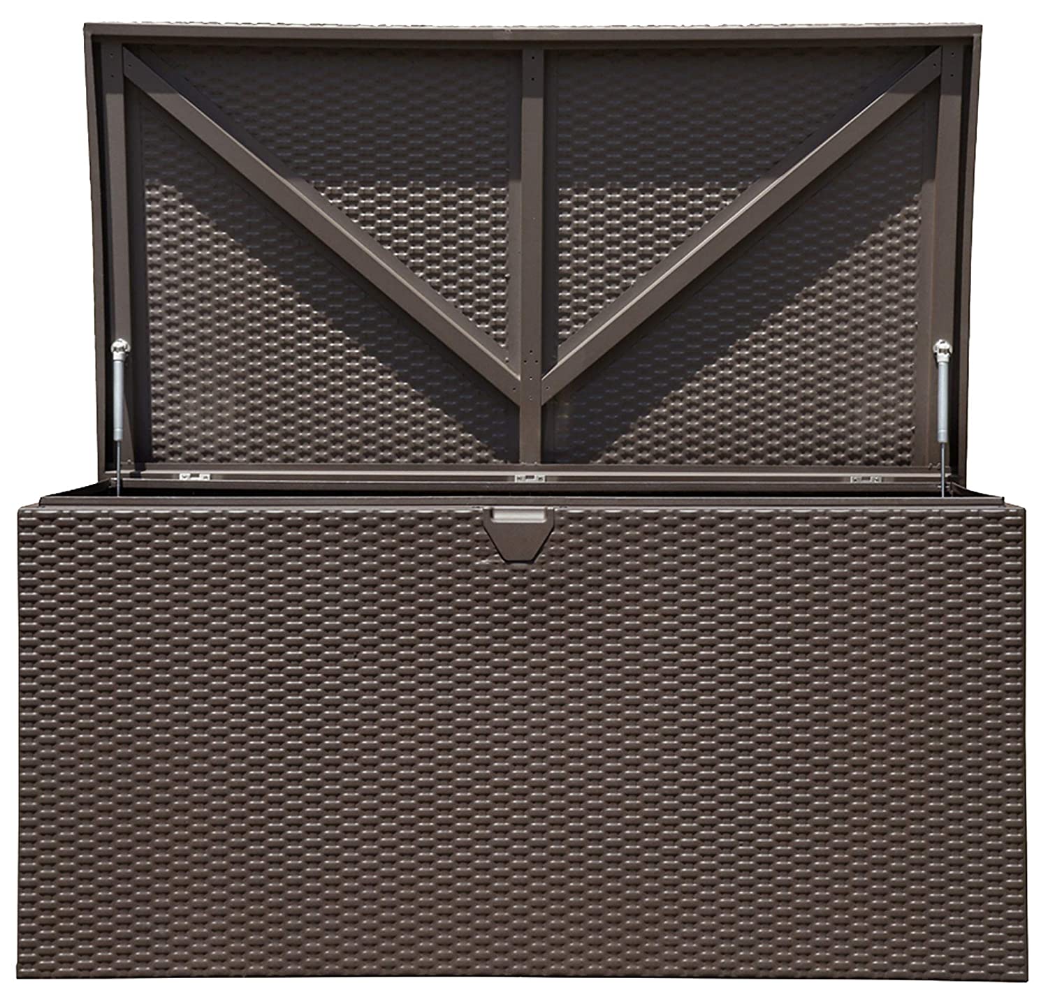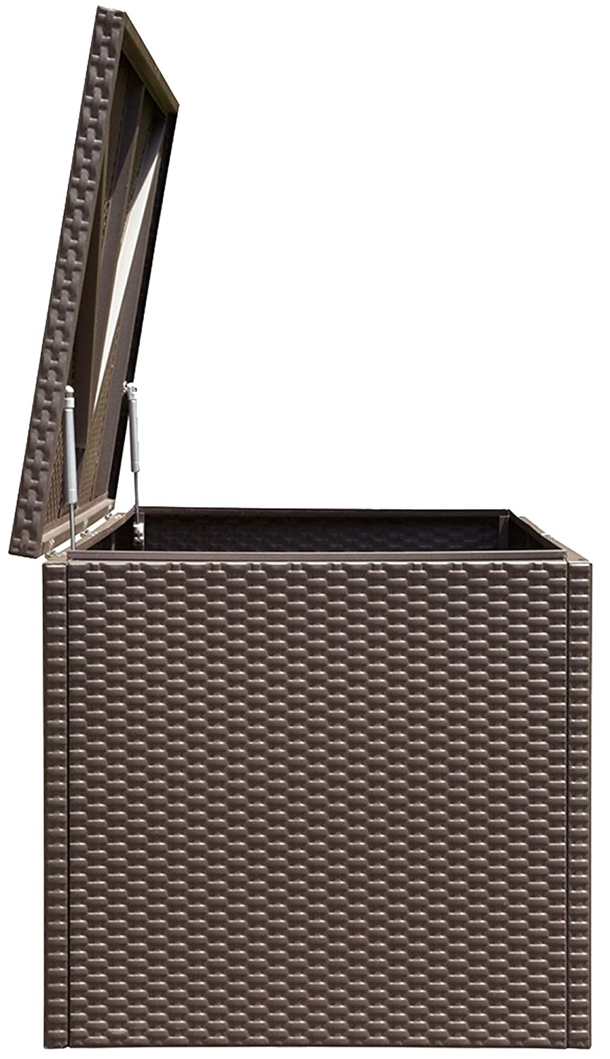 The Arrow Spacemaker Deck Box is an attractive and versatile outdoor storage bench with roomy, and convenient storage. If you're looking for storage for the poolside or a container for your outdoor patio, you need to look no further. Need something sturdy that'll store patio accessories during any season? Or need some indoor storage for your living room? The Spacemaker Deck Box is the perfect storage solution. With 134 gallons (509 liters) of storage space, the Spacemaker is ideal for storing garden supplies, patio seat cushions, outdoor gear, sports equipment, marine supplies, tools and equipment, and more! Constructed of hot-dipped galvanized steel, the Spacemaker Deck Box stands up to corrosion, extreme weather conditions, and protects against rot and insects. The built-in corrugated floor provides additional strength and keeps items dry. Your stored items remain secure with the integrated security hasp and fits most combination locks and padlocks for securing your items. The improved pneumatic lift supports controlling the opening and closing of the lid and won't close on your hands or fingers. The patented design allows for easy do-it-yourself assembly in just 30 minutes! Comes in an attractive, basket weave style exterior with a powder coated finish in Espresso. It's sure to complement a variety of decks, lawns, patios, and other outdoor areas. Assembled Exterior Dimensions: 4'4" x 2'3" x 2'2" Assembled Interior Dimensions: 4'3" x 2'1" x 2'Assembled Weight: 64 poundsTotal Storage Space: 134 gallons (509 liters)