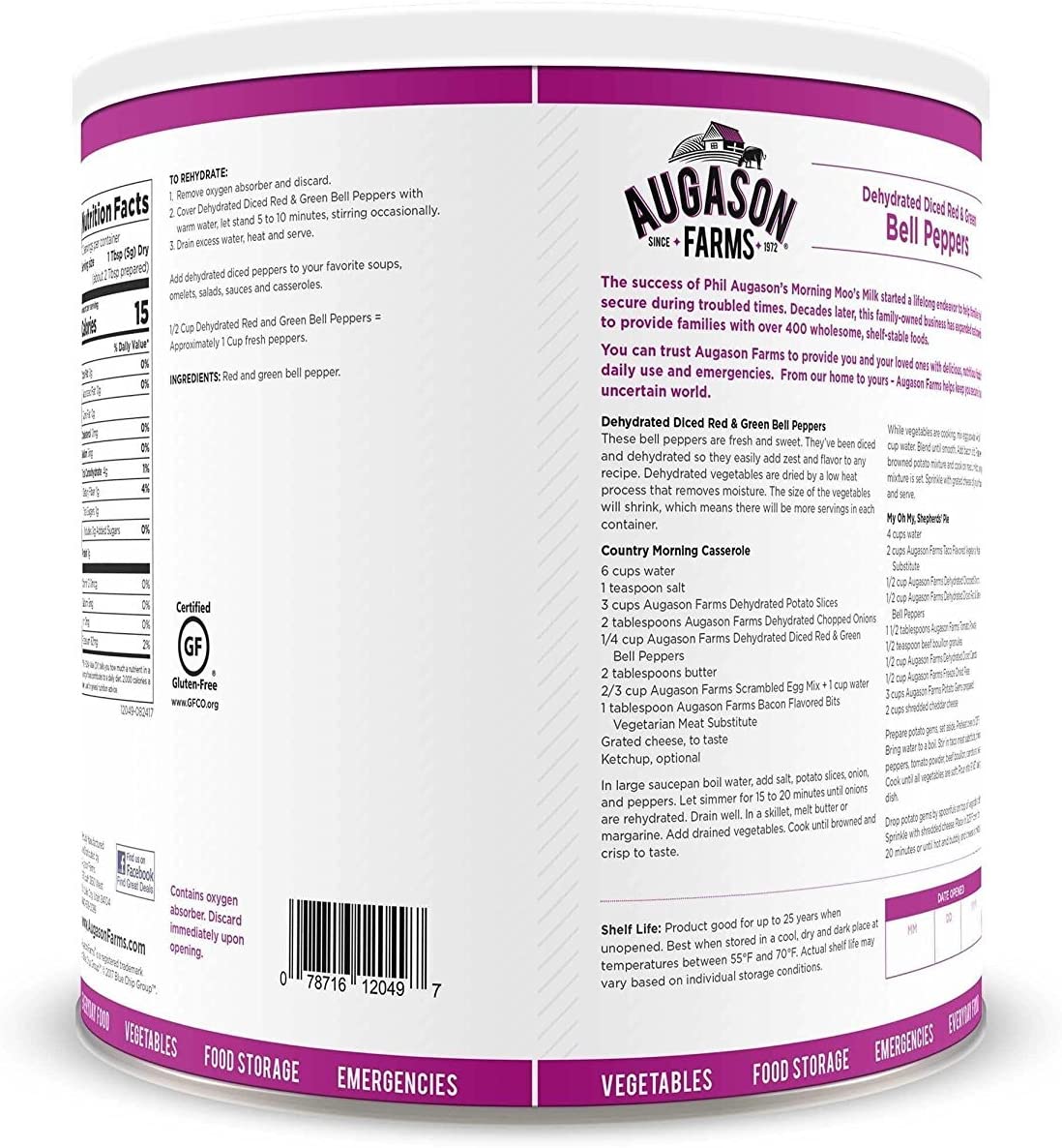 The Augason Farms Dehydrated Diced Red & Green Bell Peppers 1 lb 4 oz No. 10 Can are fresh and sweet. The peppers have been diced and dehydrated so they easily add zest and flavor to any recipe. This is a Certified Gluten-Free and an all natural product that consists of 113 Servings and 1,695 Calories, with a shelf-life of up to 25 years. All this convenience makes it perfect for Food Storage, Emergencies, Survival, Camping, and Everyday Use! Make the wise decision and let Augason Farms give you a peace of mind that's as indispensable as it is delicious. Family owned and operated since 1972, Augason Farms believes that great taste is a tradition worth preserving. They'll provide you with delicious peace of mind with their food essentials. Please discard oxygen absorber after opening. Best when stored in a cool dry place at temperatures between 55 Degree and 70 Degree F (ideal humidity 15%).