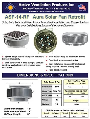 Model ASF-14-RF has a 14 in. Dia throat opening and a 15-Watt solar panel providing energy to 4 EC fans on sunny days to increase the CFM (Cubic Feet per Minute) of 1007 @ 0.1 SP of air flow performance. It is an excellent choice to exhaust attic heat in the summer and exhaust moisture in the winter. The Aura Solar Attic Fan Retrofit will produce 360 CFM at 11 mph without the solar powered fans through its patented engineered design with no moving parts.