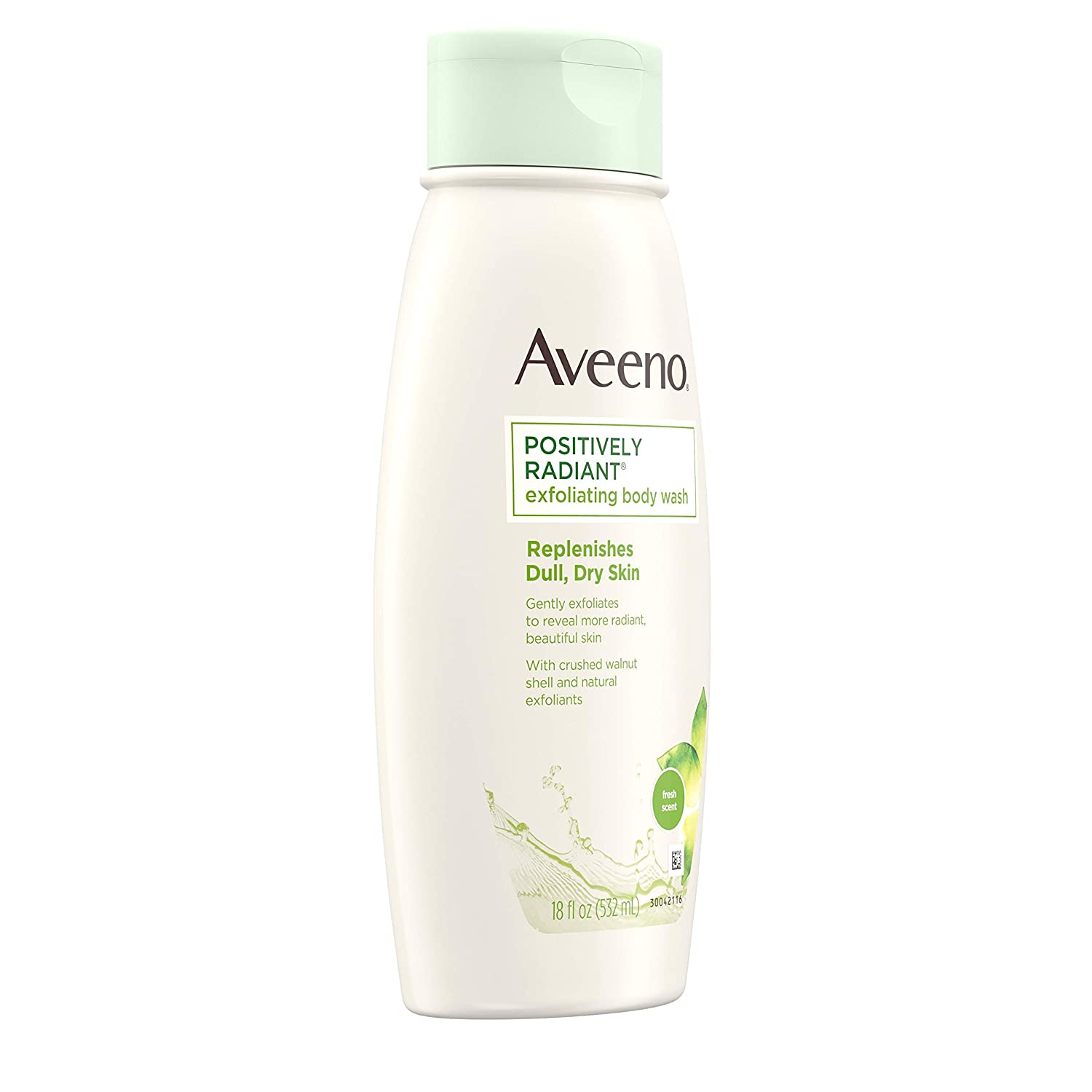 - 18-fluid ounce bottle of Aveeno Positively Radiant Exfoliating Body Wash gently exfoliates and cleanses skin leaving it feeling soft and smooth after just one use