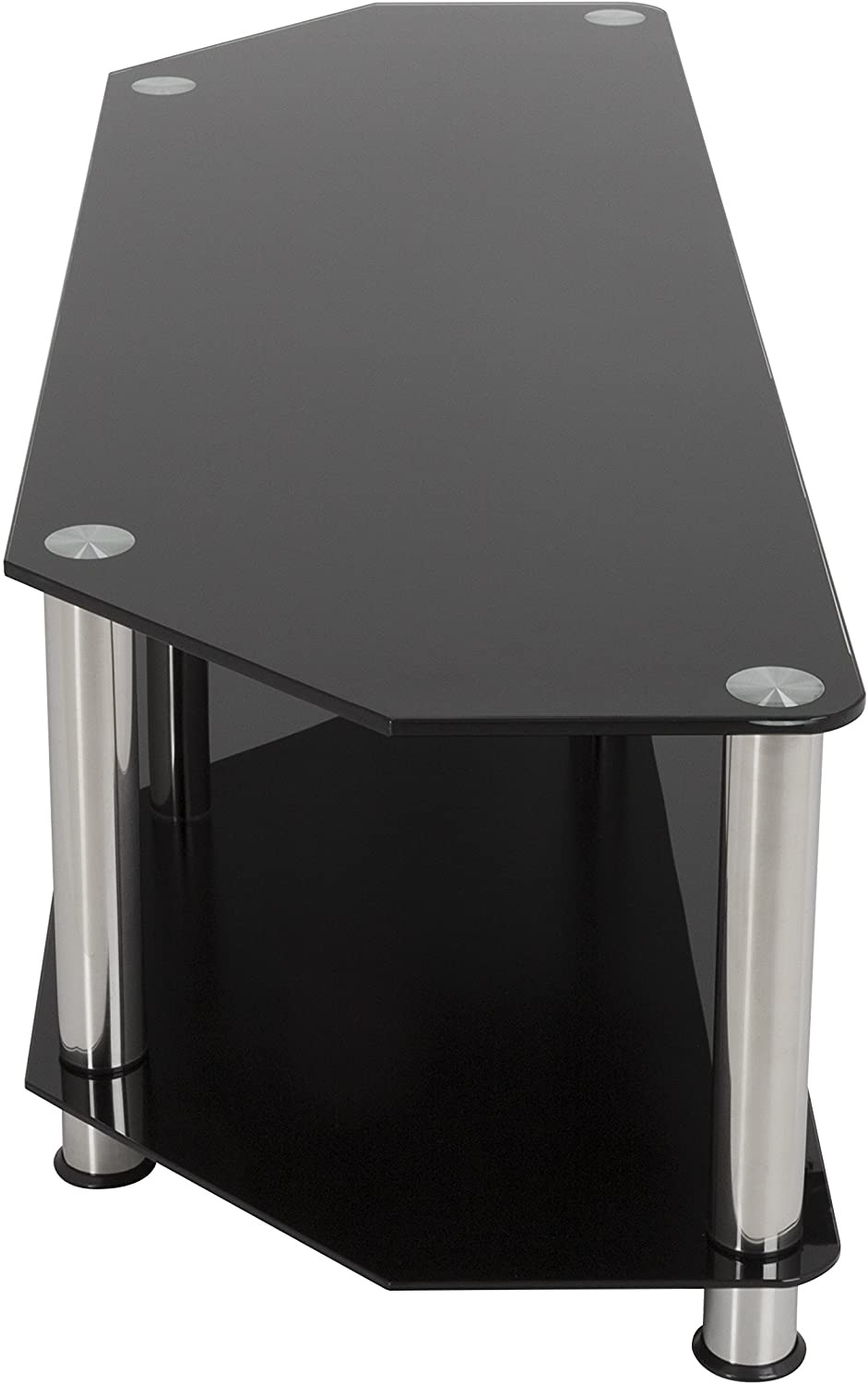 The sac family is a simple, attractive, and versatile series of a/V stands and tables, in multiple sizes. The high quality, Easy to assemble stands blend with virtually any decor. The AVF SDC1400-A supports flat panel TVs up to 65". The Black tempered glass and durable chrome legs modernize any space while the angled corners provide multiple room placement options including into corners to maximize space and viewing angles. The bottom shelf is perfect for AV components such as digital receivers, DVRs, Blu-ray, gaming consoles, speakers, Apple TV, sons devices, etc. Wide-spread feet are becoming more common on TVs. For TVs with this base configuration, please measure carefully and compare to the dimensions of these TV Stands to ensure the TV will fit on the TV stand. Tus with traditional pedestal-style base will fit on this stand with no issues. If you are unsure, it may be best to purchase the next largest size TV STAND, or a replacement pedestal base for your TV. AVF offers, pedestal-style TV bases for sale separately for all TVs if needed.