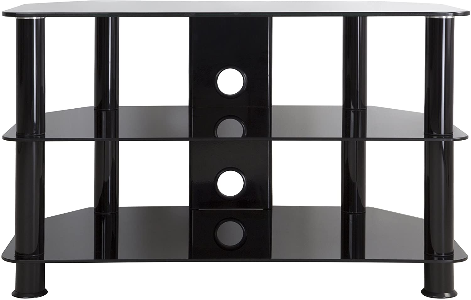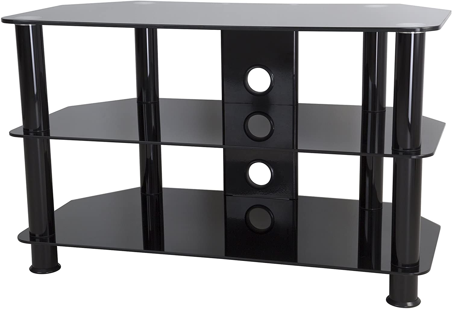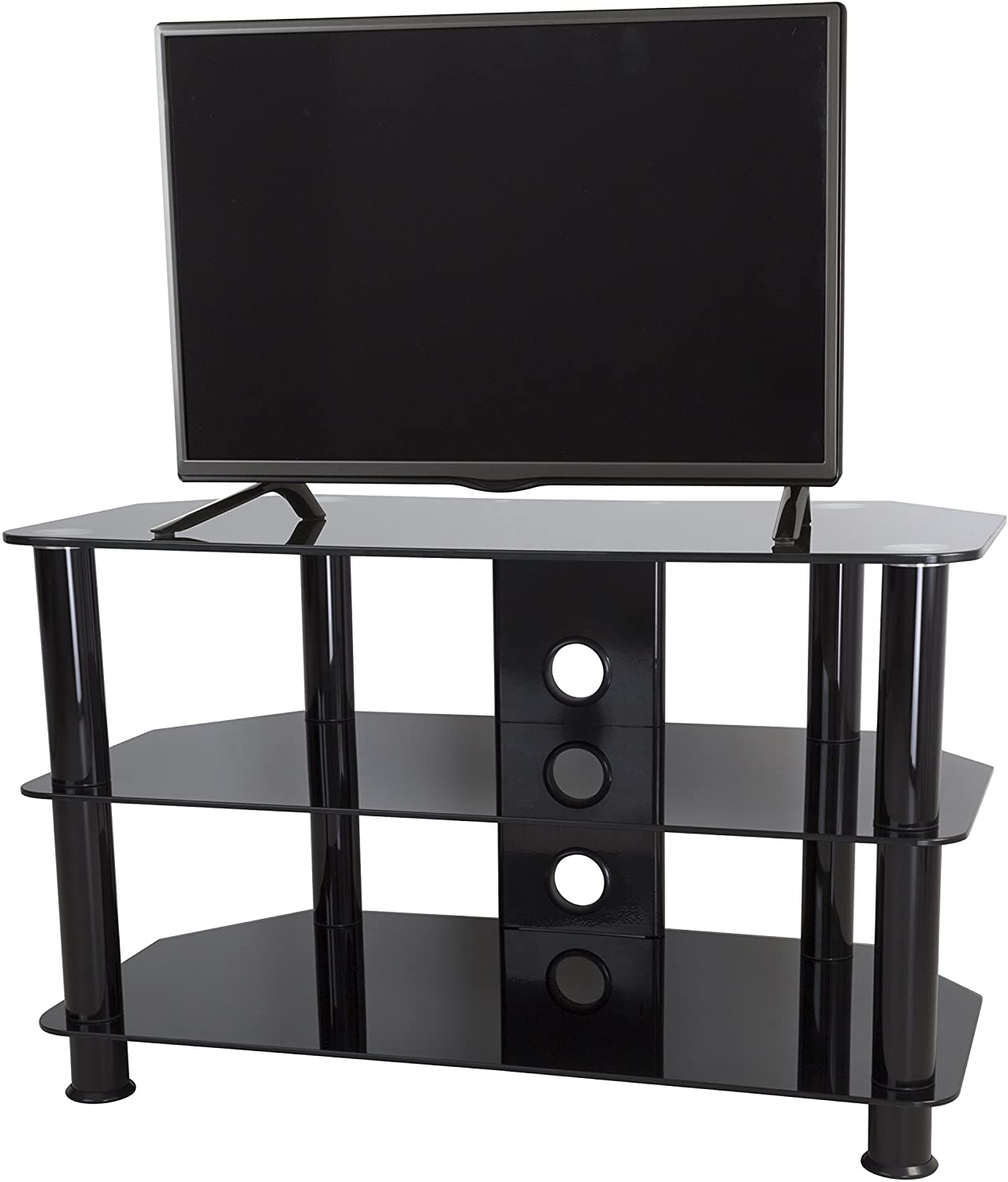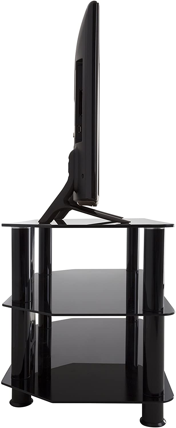 The sac family is a simple, attractive, and versatile series of a/V stands and tables, in multiple sizes. The high quality, Easy to assemble stands blend with virtually any decor. The AVF SDC800CMBB-A supports flat panel TVs up to 42" And up to 99 lbs. The Black tempered glass and durable chrome legs modernize any space while the angled corners provide multiple room placement options including into corners to maximize space and viewing angles. Middle and bottom shelves are perfect for AV components such as digital receivers, DVRs, Blu-ray, gaming consoles, speakers, Apple TV, sons devices, etc. Cable management through the center column delivers a tidy appearance. Wide-spread feet are becoming more common on TVs. For TVs with this base configuration, please measure carefully and compare to the dimensions of these TV Stands to ensure the TV will fit on the TV stand. Tus with traditional pedestal-style base will fit on this stand with no issues. If you are unsure, it may be best to purchase the next largest size TV STAND, or a replacement pedestal base for your TV. AVF offers, pedestal-style TV bases for sale separately for all TVs if needed.