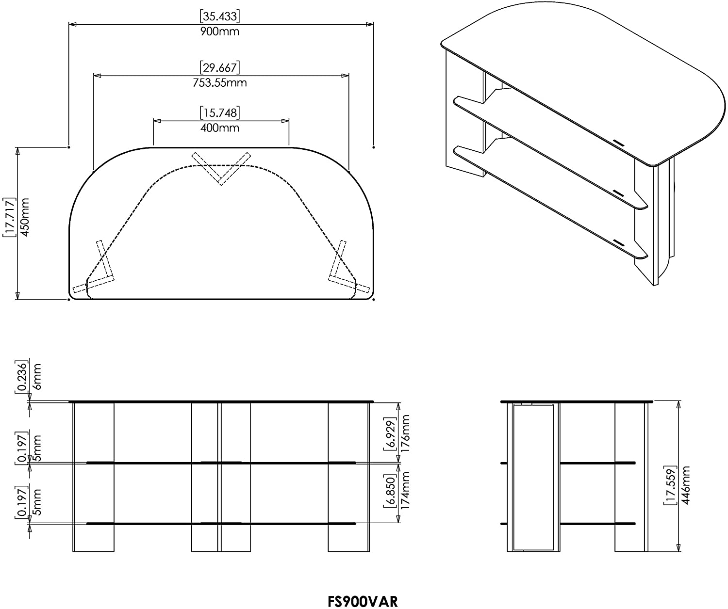 The FS900VARWB-A (Varano) is a stylish, understated, ready to assemble TV Stand in Walnut wood-effect. The black tempered glass shelves support a TV up to 81 lbs (up to 42"), as well as AV components up to 22 lbs per shelf. The angled back corners allow for multiple positioning options, as it can be placed flat against a wall or into a corner of a room, providing ideal viewing angles for a larger area. The two lower shelves are perfect for AV components such as Digital Receivers, DVRs, Blu-ray, or Gaming Consoles. Installation is kept neat via the built-in cable management the length of the central column so all power and connectivity wires can easily reach the equipment in an organized, tidy fashion. Fits most TVs in these sizes: 24", 27", 32", 37", 39", 40", 42". For TVs with wide-spread feet, please measure the foot width to verify fit on this TV stand. Assembled dimensions: 35.43-inches (width) x 17.72-inches (depth) x 17.52-inches (height).
