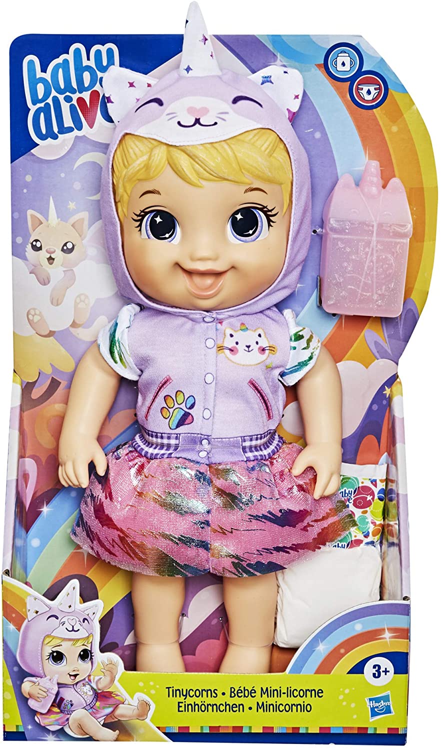 Meet Baby Alive Tinycorns: a fairytale-worthy baby squad with fantastical adventures in store! Where will your child’s imagination take them? Sliding down a colorful rainbow? Gliding across a starry sky? Or maybe to a fantasy tea party in the clouds with the whole Tinycorns gang! This adorable Tinycorns doll comes wearing a shiny, hooded Cat Unicorn dress and matching sparkly bottle. Baby Alive Tinycorns dolls makes a great gift for girls and boys ages 3 years old and up! (Each doll sold separately. Subject to availability.)