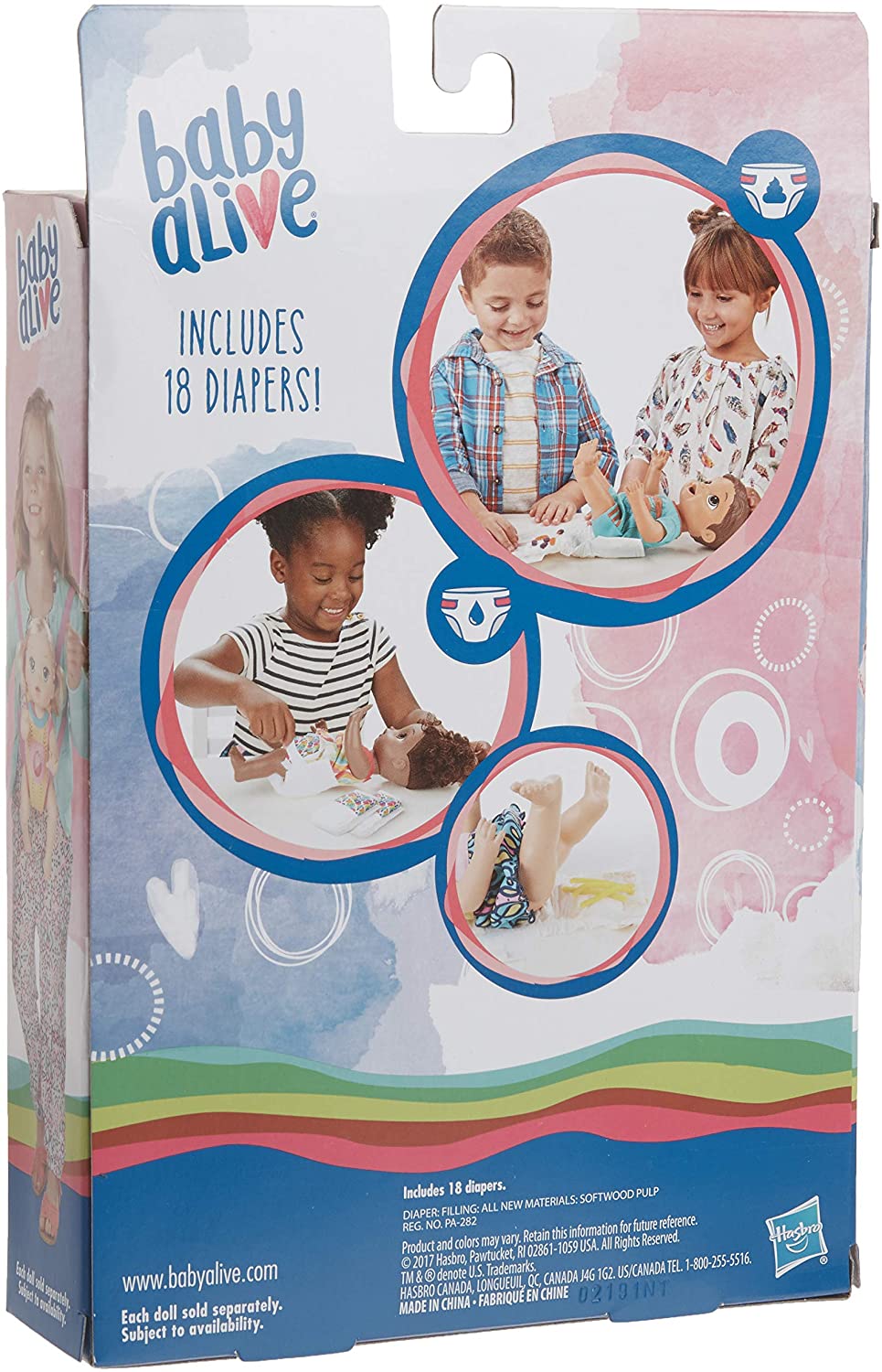 Changing time is a big part of being a mommy or daddy. . .and extra diapers are always handy to have! Stock up for diaper changing fun with the Baby Alive Diaper Refill Pack. This pack includes 18 diapers that fit Baby Alive dolls that drink and wet or eat and "poop" (dolls each sold separately). Kids can change their baby dolls into a clean, fresh diaper, just like a real mommy or daddy would.