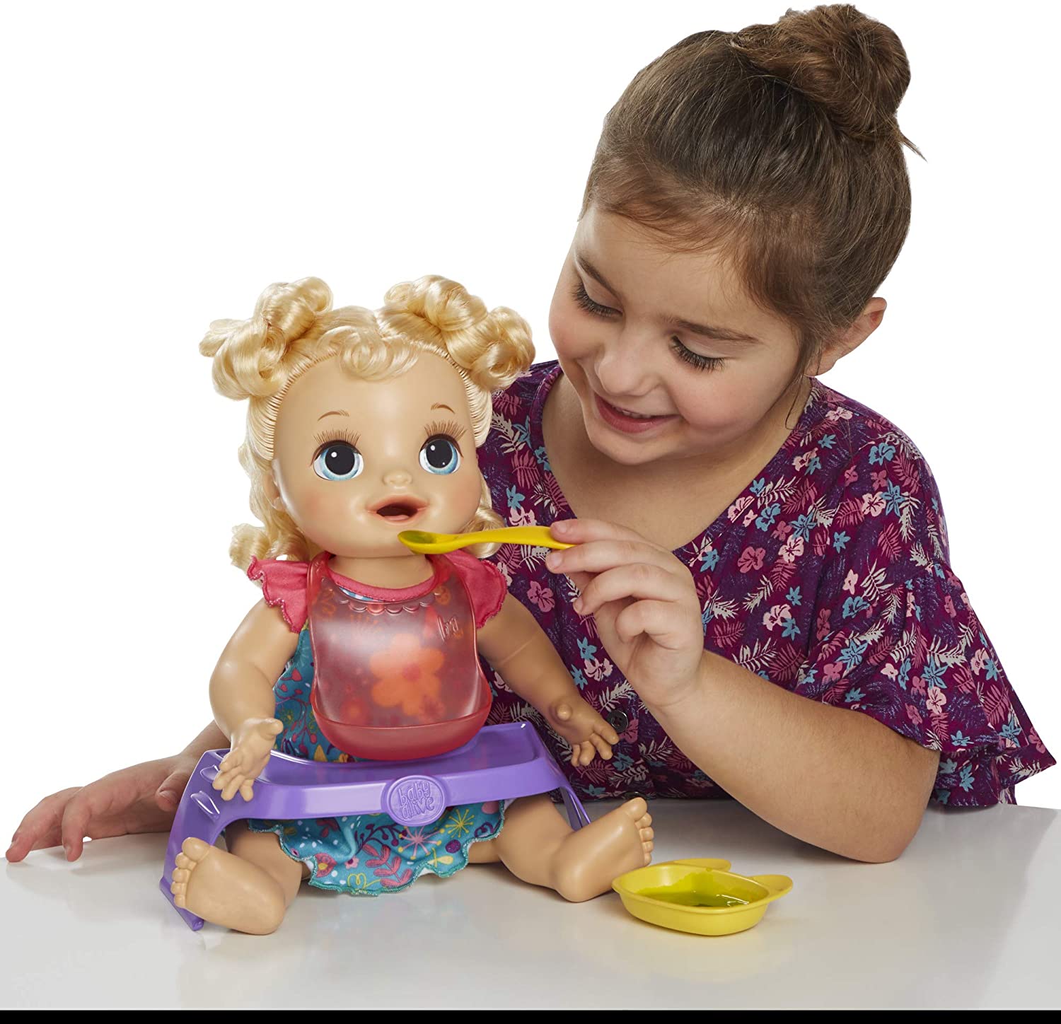 - Fun feeding and changing accessories - put baby's bib on and sit her at her feeding tray while you mix up her favorite food! Doll comes with everything kids need to make baby’s food, feed, and change her
