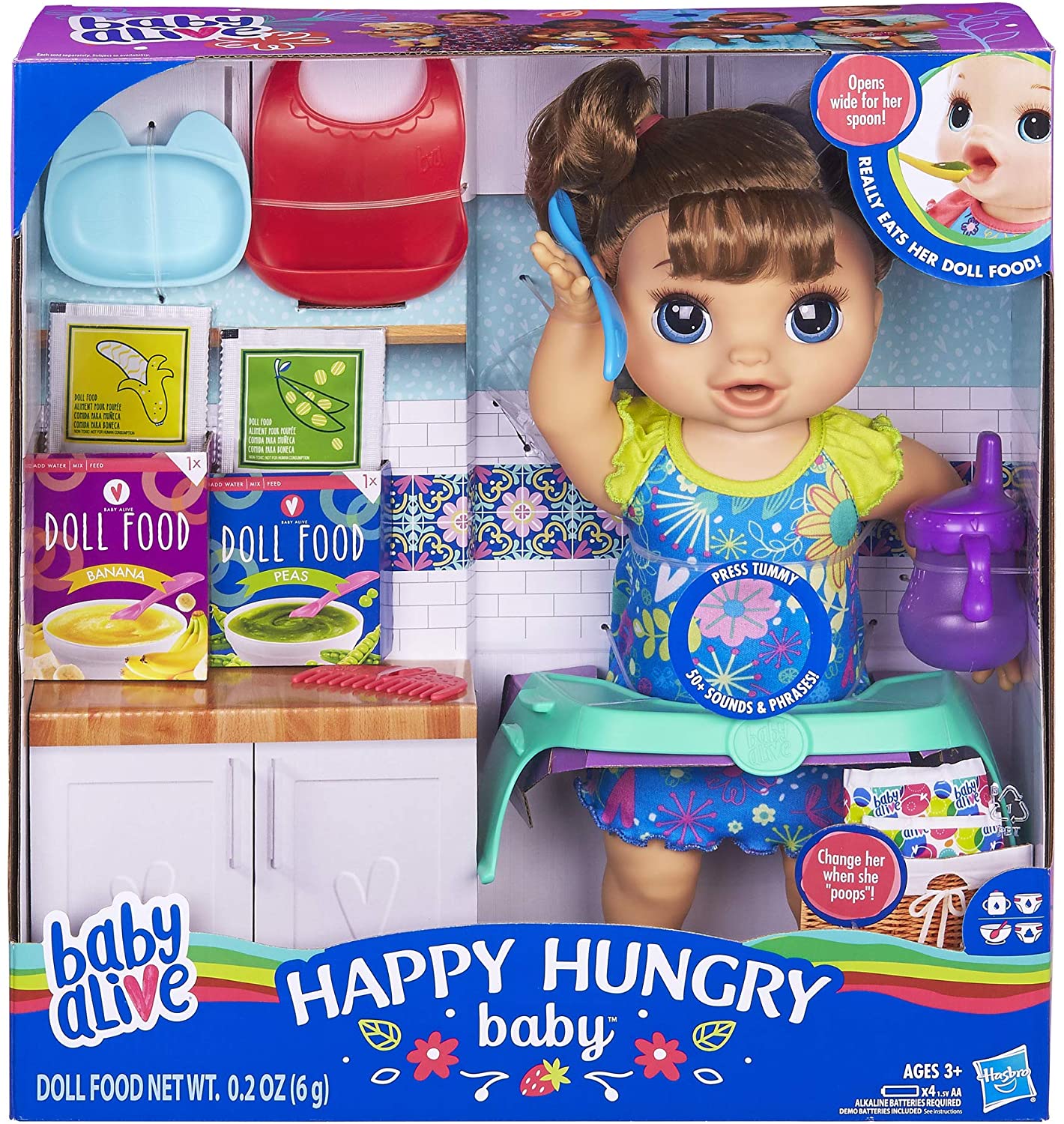- Baby doll for kids ages 3 and up - it's so much fun to feed a baby who loves to eat.This happy Hungry baby opens wide, moves, talks, drinks, “pees,” and “poops.” a great gift for girls and boys ages 3 years old and up