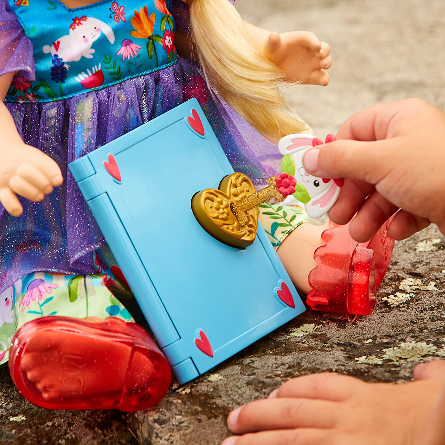 • Her individualized accessories include a dress, hooded cape, and key charm necklace that kids can wear and use to unlock her book