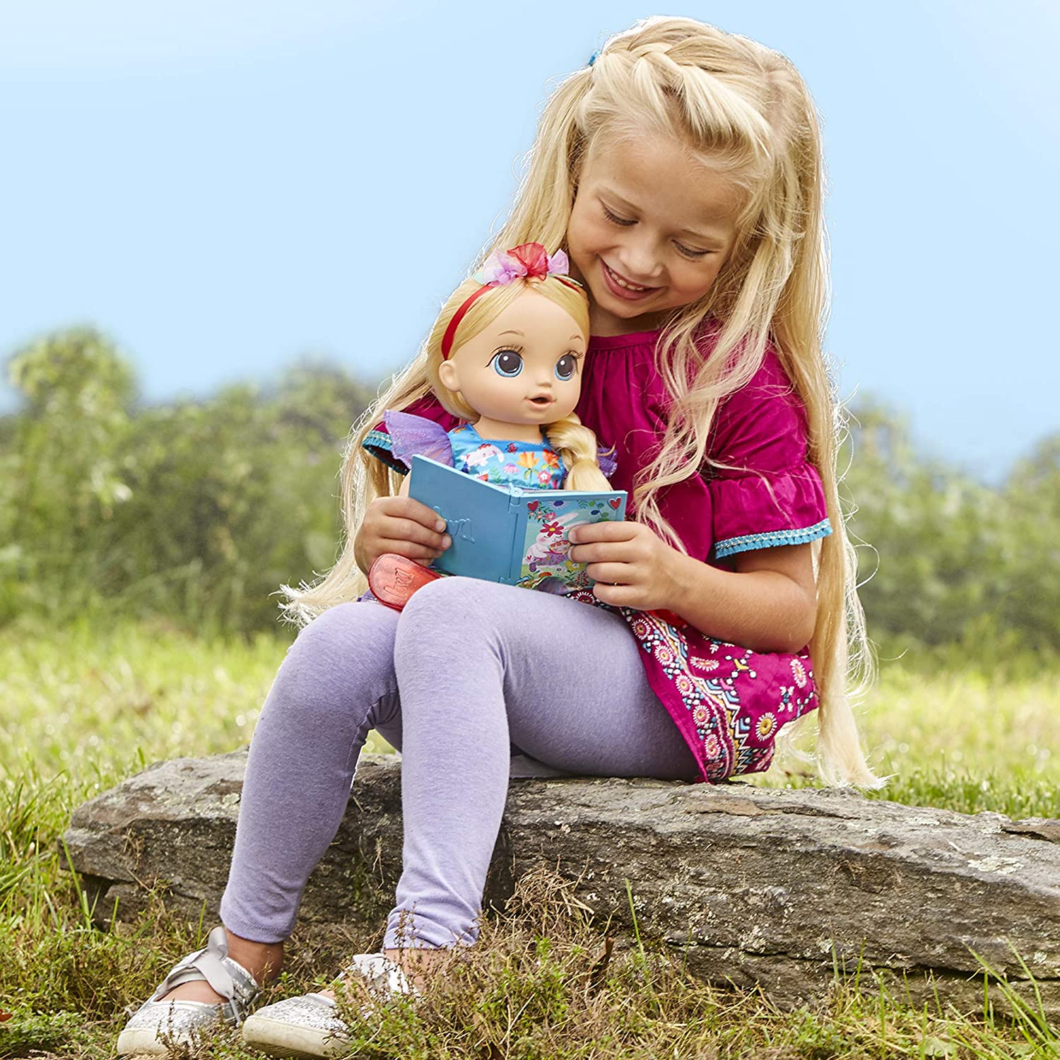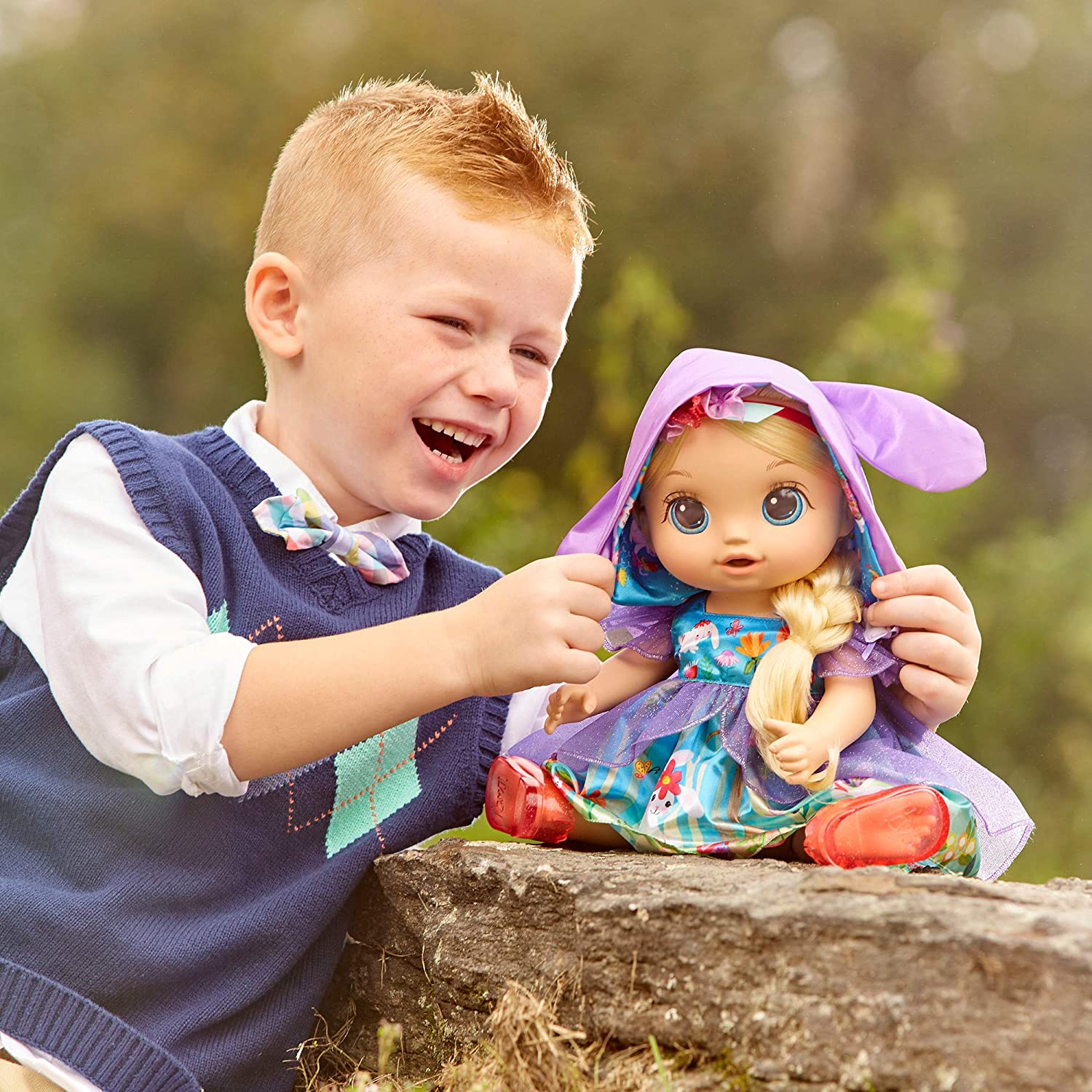 Bright-eyed and bubbly, Forest Emma was discovered by her bunny best friend in the heart of the fairytale forest! Their days together are filled with sweet snuggles, hippety-hop adventures through the garden, and listening to the magical sounds of the woodland. Imagine Emma’s bunny friend turns into a special plush so that when little mommies and daddies bring Emma to her forever home they can stay together always. Kids can explore a storybook world with this Special Edition Once Upon a Baby doll. The Forest Emma doll comes with the snuggly bunny plush and an illustrated book sharing their friendship story. She also includes a unique removable outfit, shoes, hooded cape, and wearable key charm that unlocks her book! When kids hug her, she makes giggling and sing-song sounds. Give her a bottle to drink and she makes sweet drinking sounds, then “pees” her diaper. Time for a diaper change! With such a rich fantasy world, kids will want to collect all three Baby Alive Once Upon a Baby: Forest Tales dolls. Also look for Forest Mia and Forest Luna. (Each sold separately. Subject to availability.) Baby Alive and all related properties are trademarks of Hasbro.
