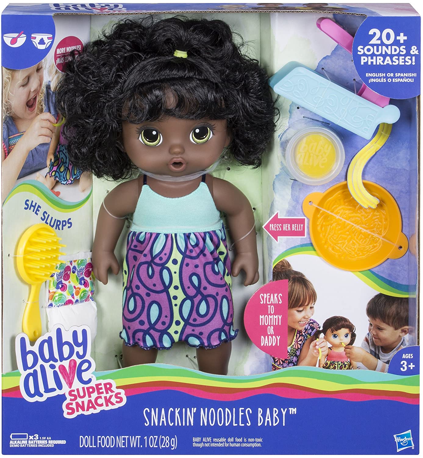 Making zany noodles is oodles of fun! The Baby Alive Snackin' Noodles Baby doll is a sweet little girl who asks for her noodles! She comes with an extruder and a bowl so kids can load the extruder with reusable doll food to turn it into noodle shapes! Fill her bowl and feed her the noodle shapes! Then, it's time for a diaper change -- kids can open the diaper to see that she's "pooped" and clean her up for more play time fun. Tickle her belly and she'll start talking! Flip the switch in her back to choose who she's speaking to -- she says "Mommy" and "Daddy" so girls and boys can play out fun, meal-time moments. The Snackin' Noodles Baby doll tells kids when she's hungry, asks for pretend noodles, thanks Mommy or Daddy, and more, saying 20 plus sounds and phrases in English or Spanish. Brush and style her rooted hair and get her ready for more noodly fun! Baby Alive and all related properties are trademarks of Hasbro.