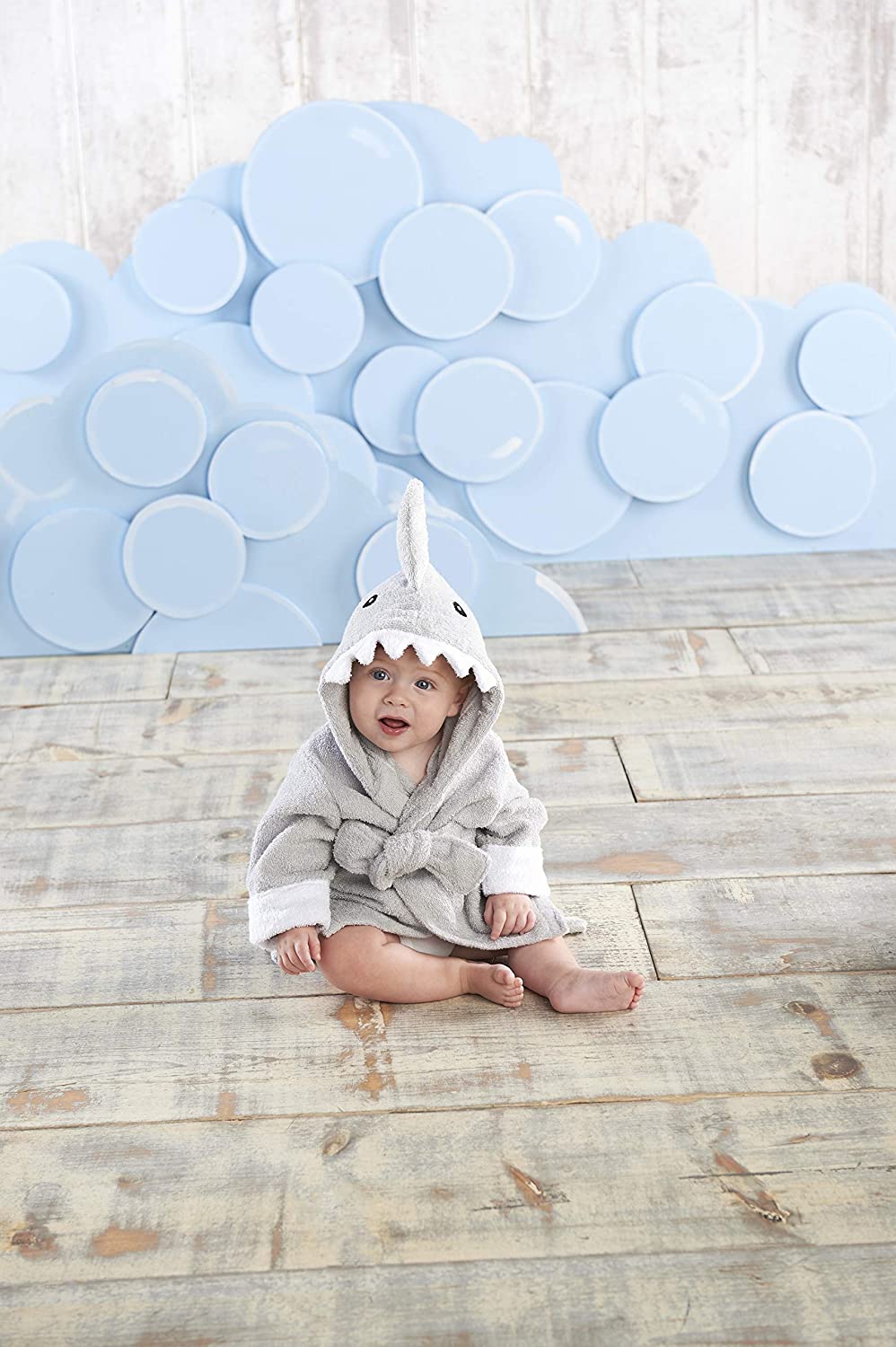 Add a little under the sea fun to bath time with this adorable shark themed gift. Our "Let The Fin Begin" Gray Shark Robe Towel is made of soft gray terry cotton and features so many fun shark elements that we don't know where to begin - ferociously adorable teeth, a fin, and of course, a tail! Perfect as a Baby Swim Cover Up For At The Beach, Pool or After Bath Time! Features and facts: Soft terry cloth spa robe features a gray shark's tail on the bottom, a gray fin on the hood and white terry teeth along the rim of the hood, along with two black eyes embroidered on the hood. Robe is machine washable, 100% cotton terry exclusive of decoration Appropriate for baby boys or baby girls ages 0-9 months Measures 25" w x 0. 78" d x 26" h