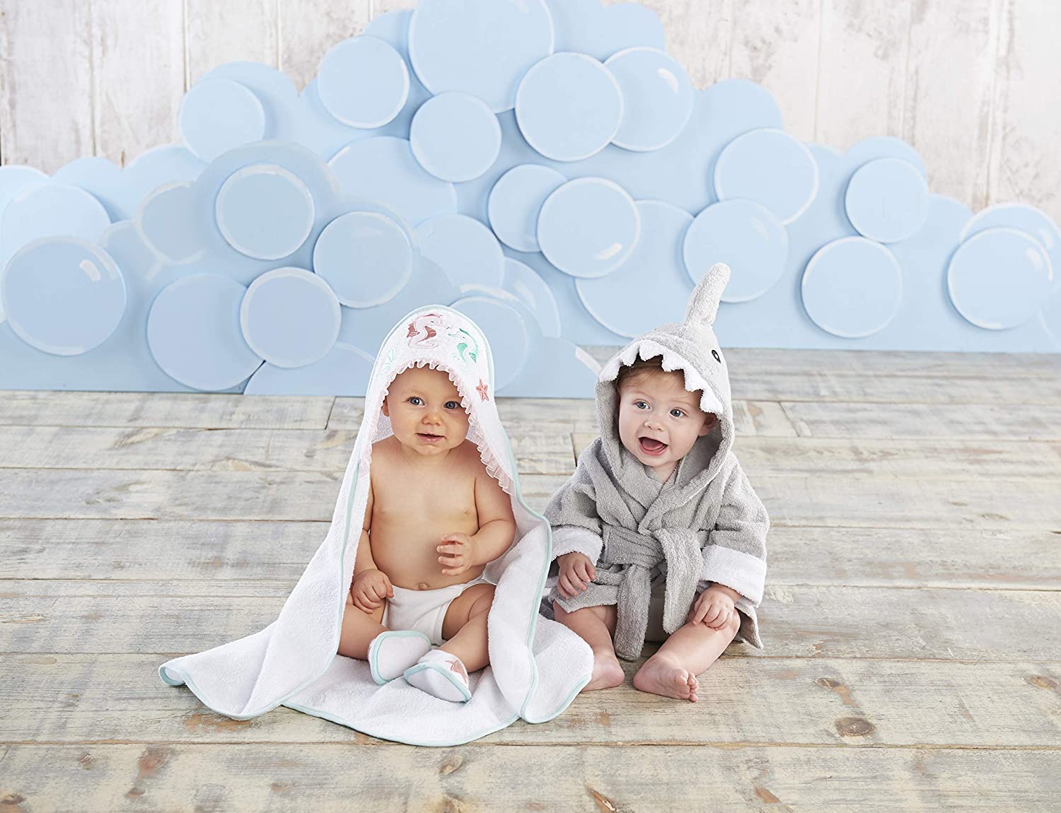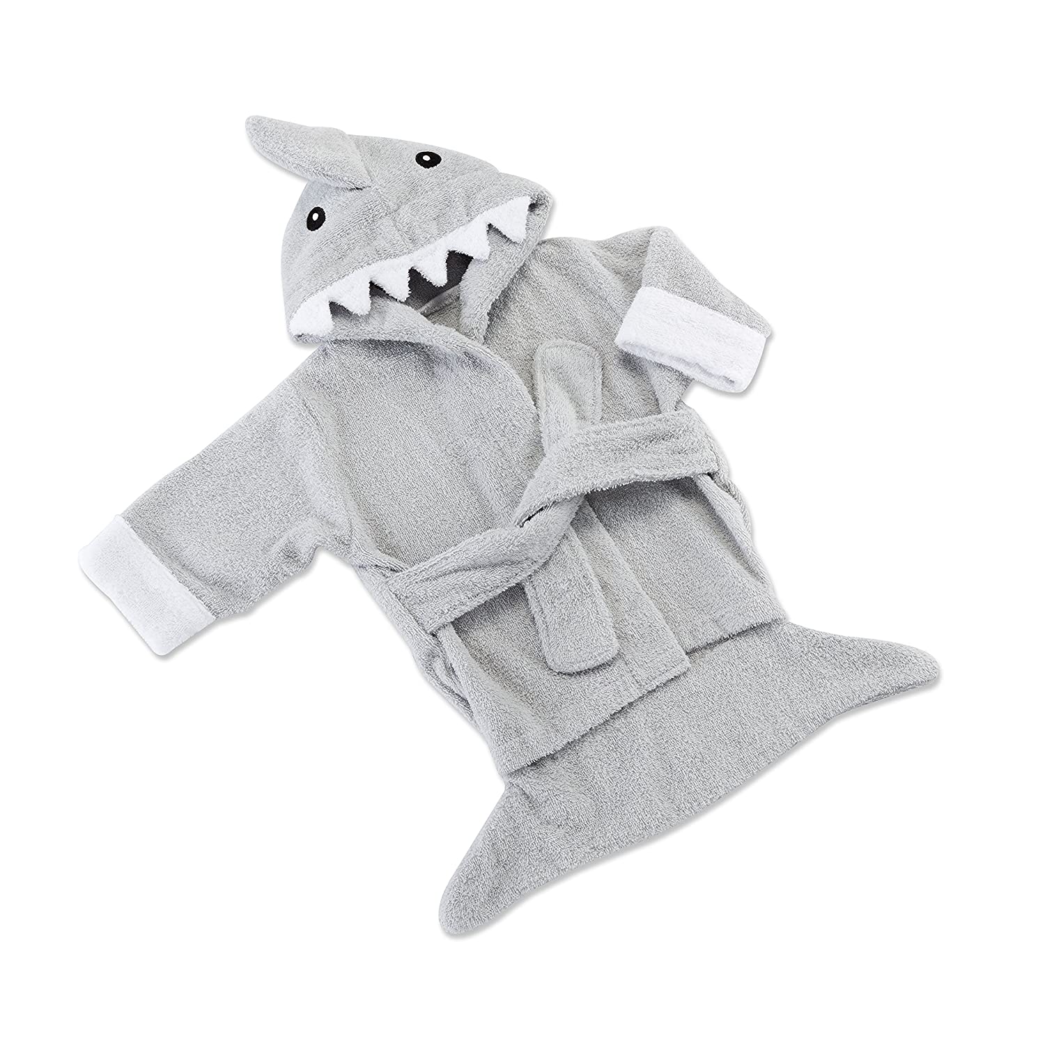 - CUTE ANIMAL DESIGN - Ultra soft cotton terry cloth spa robe features a gray terry shark's tail on the bottom, a gray fin on the hood and white terry teeth along the rim of the hood, and two embroidered black eyes on the hood.