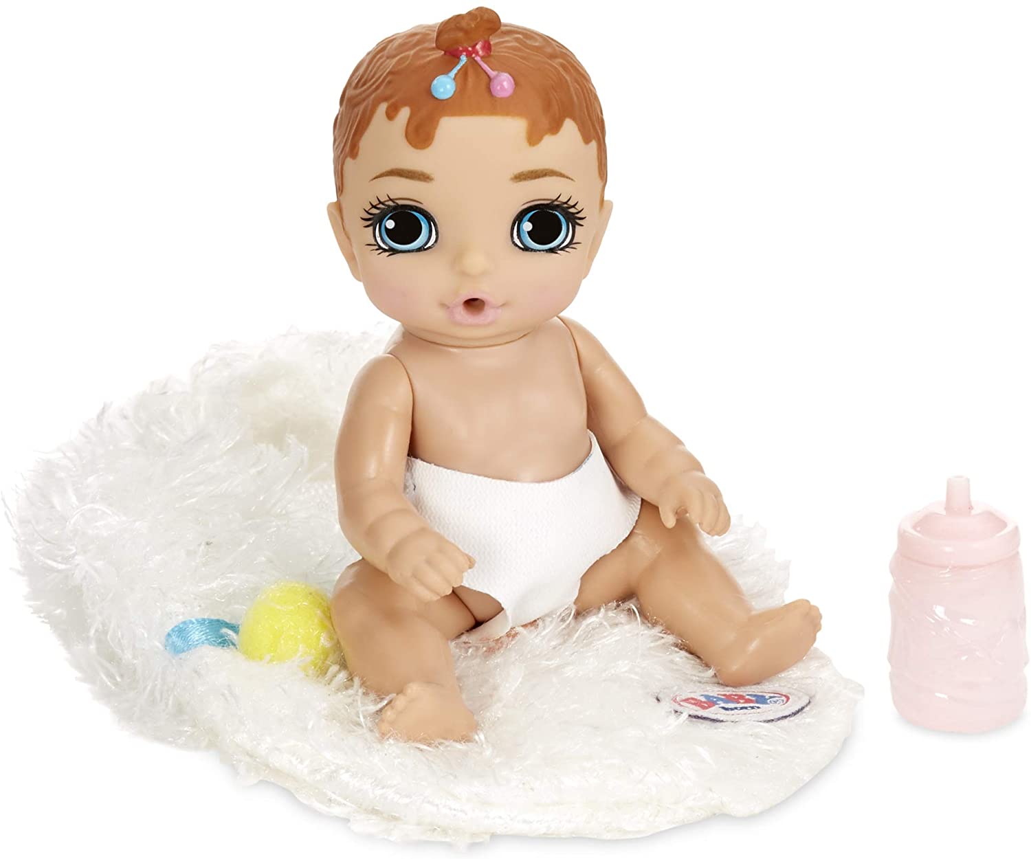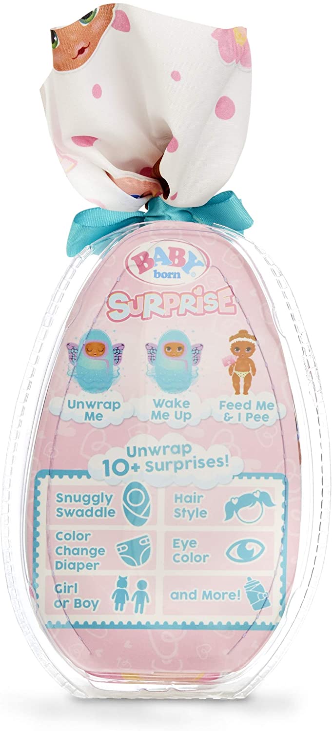 Unwrap Baby Born Surprise, the cutest little bundle of joy! Unbox all new babies, swaddles, and color change diapers! Unwrap the adorable package wrapped in a real fabric blankie and discover which sweet baby is inside. Each baby is bundled up in an adorable snuggly swaddle, sewn in a surprise design theme such as a pretty Mermaid or an adorable Unicorn. Use water to wake baby up and reveal baby's eye color. Unwrap the swaddle to uncover baby's unique hairstyle. Baby's bottle color tells if it's a boy or a girl. Feed baby water and they pee to reveal the color change diaper pattern. Baby's arms and legs move, so they can sit up or lay down. There are so many adorable babies, cute swaddles, and color change diapers to collect! Includes a collector's guide with surprise games to help find baby's name, birthday, and favorite food. Also includes a birth Certificate to fill out.