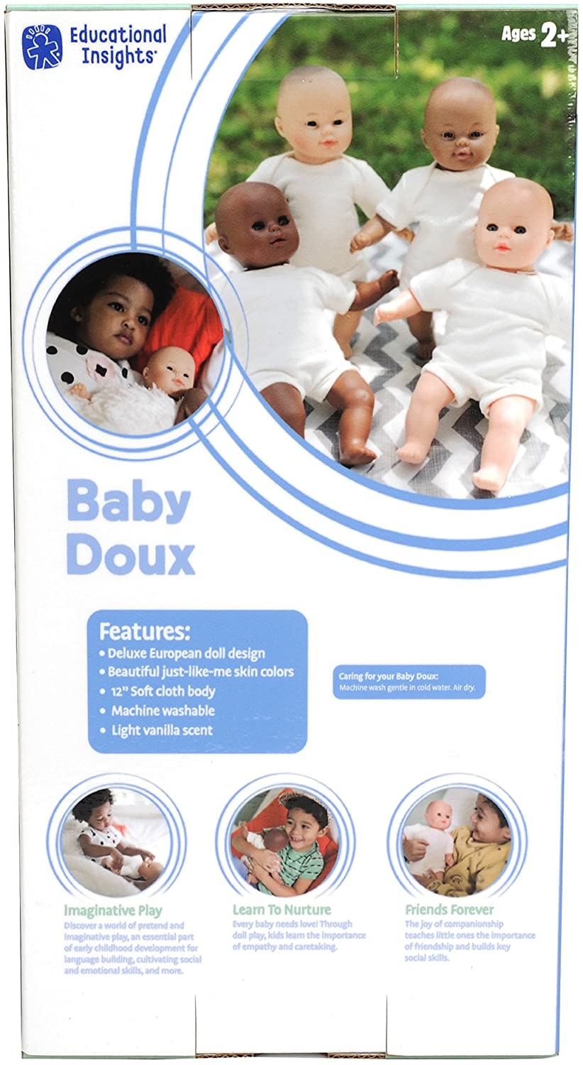 Introduce a loving world of nurturing-based imaginative play, an essential part of early childhood development, with baby Doux from Educational Insights. The deluxe European craftsmanship delivers realistic baby details and just-like-me skin tones, helping kids make real-world connections and learn the importance of empathy. Plus, imaginative play encourages social skills, language development, and so much more. These beautiful 12” soft cloth dolls are machine washable so little ones can take their babies wherever they go.