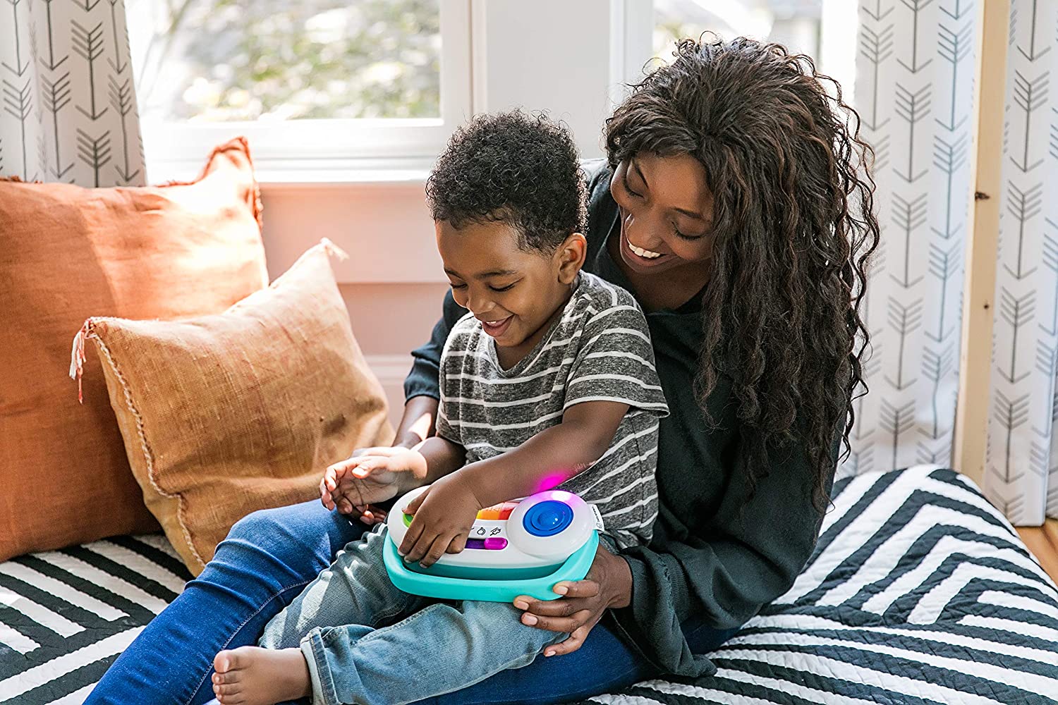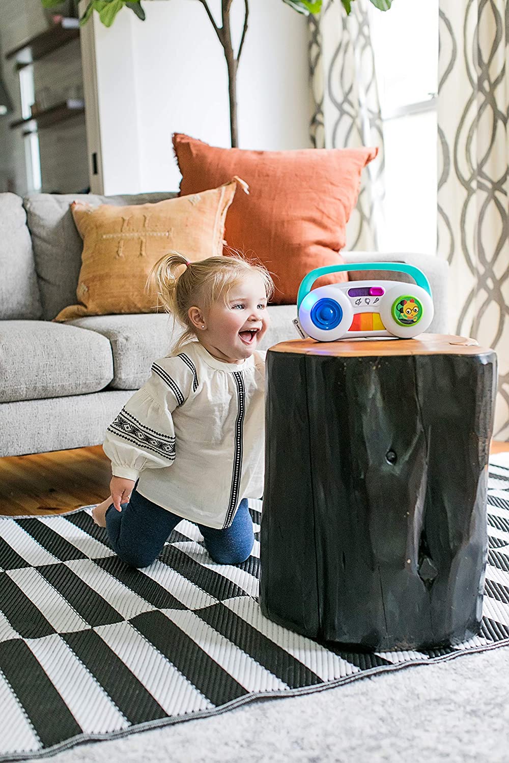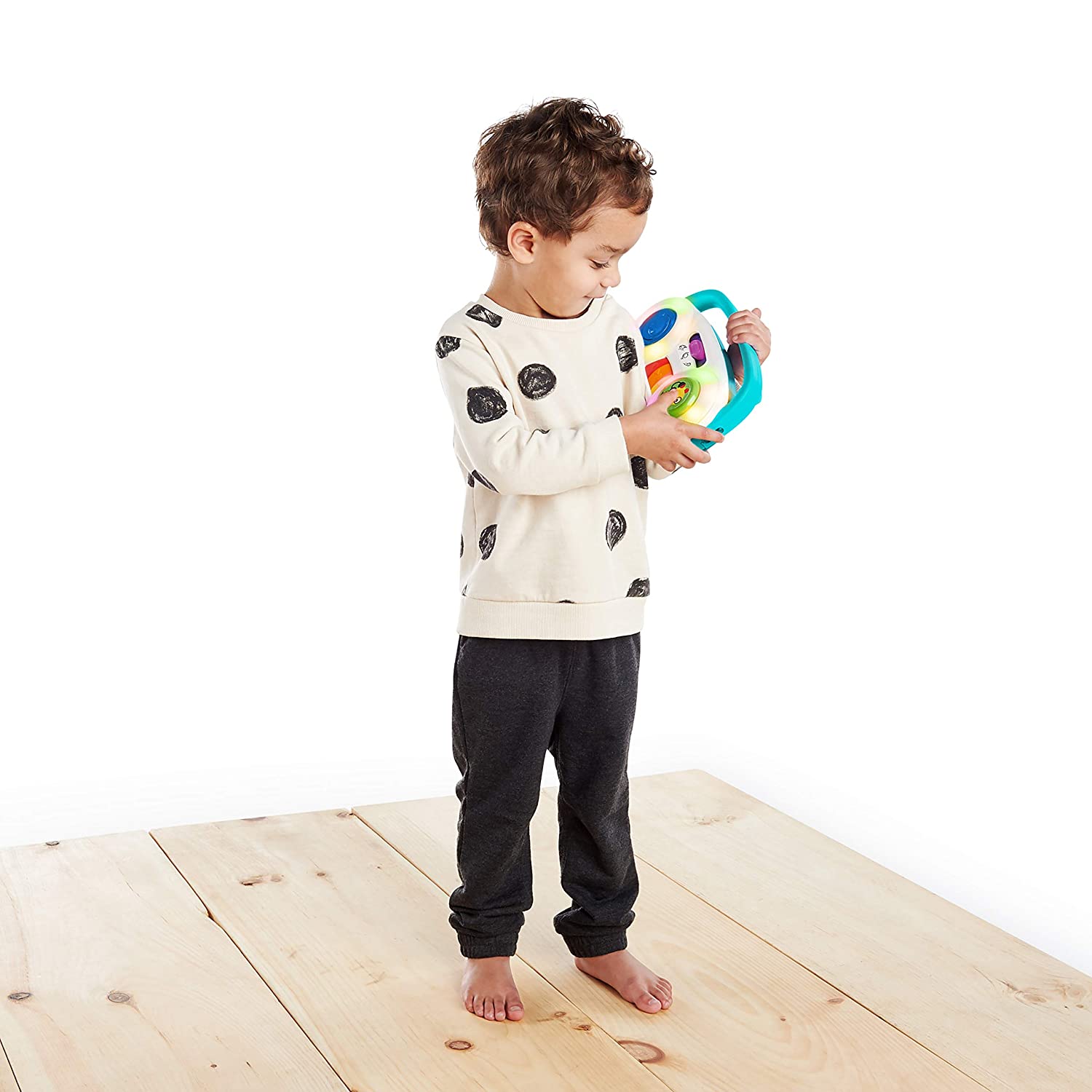 The Toddler Jams musical toy by Baby Einstein lets baby move and groove to 30+ melodies. Introduce a world of music with selections ranging from classical songs to pop music to global genres. This take along toy has an easy-to-grab handle for a concert on the go. A colorful light show plays along to the beat of the music, encouraging development of fine motor skills as baby dances to the rhythm. With bright buttons, he can pause, skip, replay or re-mix it up. This music player is a toddler toy that sparks a lifelong love of music.