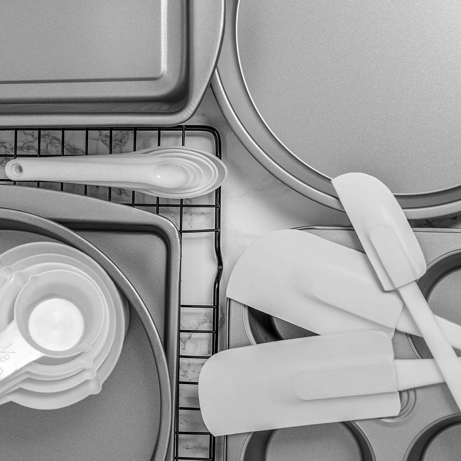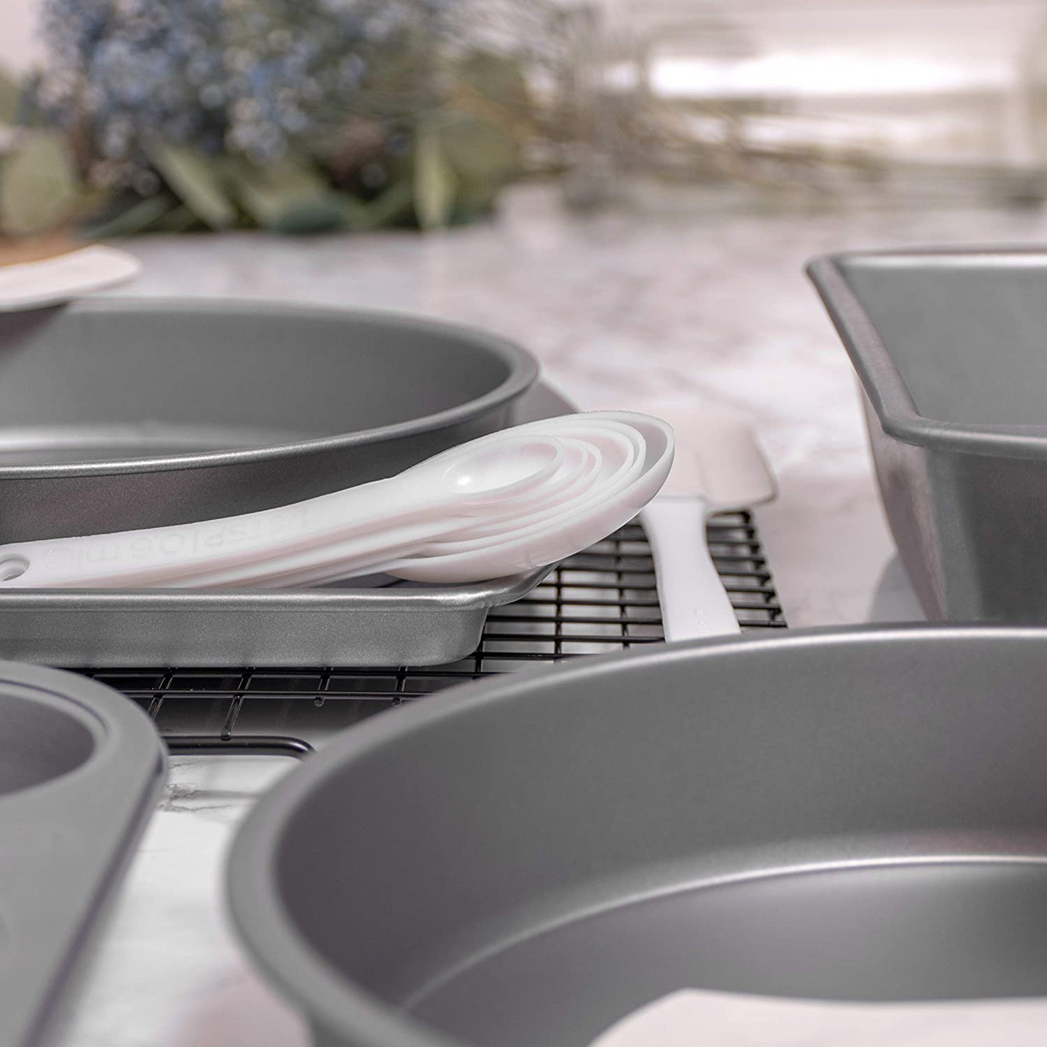Pans include DuraGlide PLUS reinforced nonstick finish 5 year limited warranty A true baker's delight The BakerEze 20 Piece Bakeware Set is sure to inspire the home baker looking to get creative in the kitchen. This set comes equipped with our most popular nonstick baking pans and accessories, so you can create a wide variety of delectable treats - from cookies and cakes, to muffins, loaves and more! Everything you need in one box, including accessories! Set includes: (2) 9 inch round cake pans, (1) 12-cup muffin pan, (1) 15.2 x 10.2 inch medium cookie pan, (1) 9.3 x 5.2 x 2.7 inch loaf pan, (1) Set of 3 Rubber Scrapers, (1) set of 6-piece measuring spoons, (1) set of 5-piece measuring cups, and (1) 15.9 inch x 10 inch cooling rack.