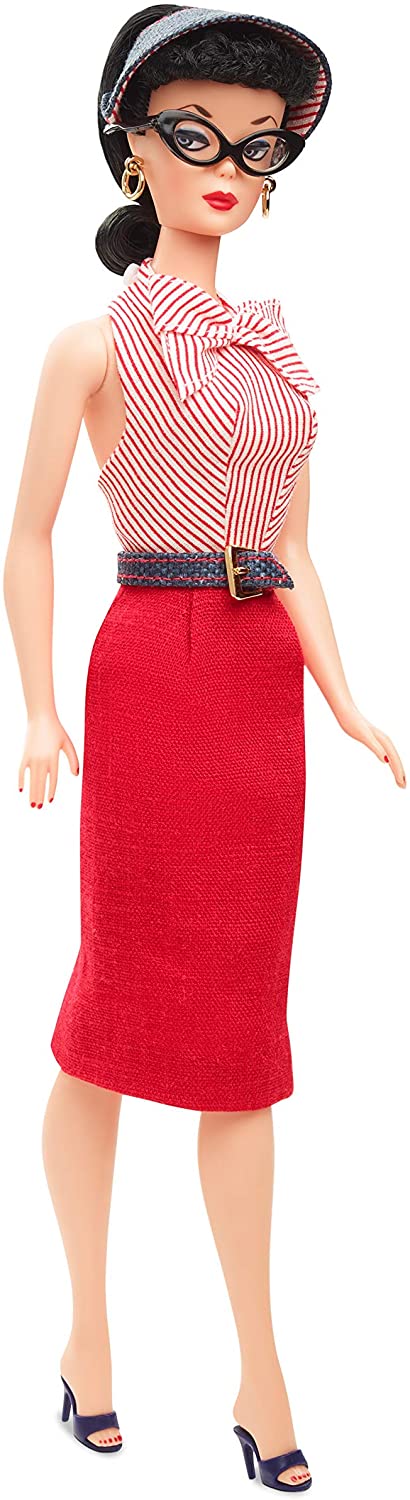 - Reminiscent of a vintage look, this collectible Barbie doll wears a red skirt and tailored jacket over a red and white pin-striped blouse bodysuit.