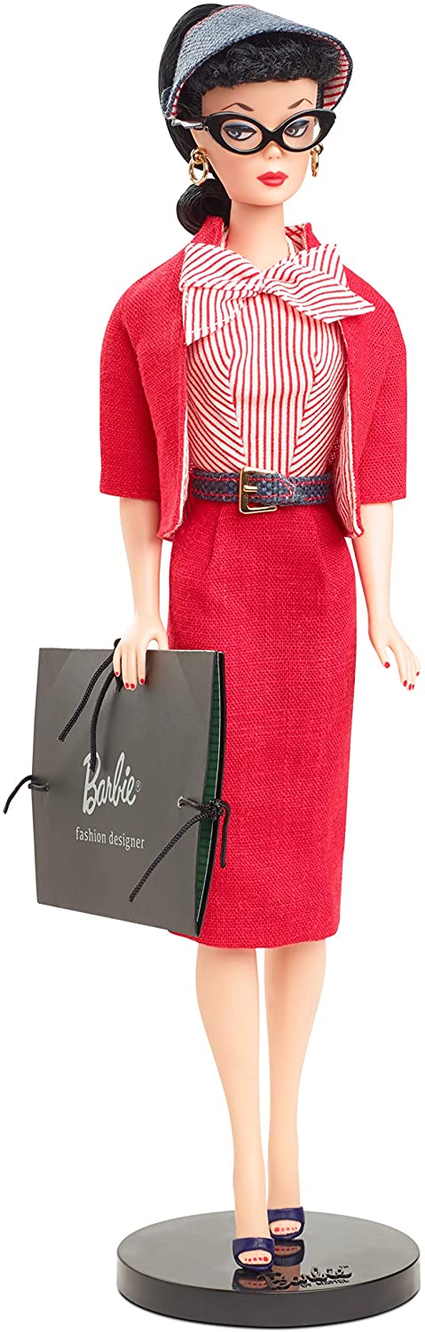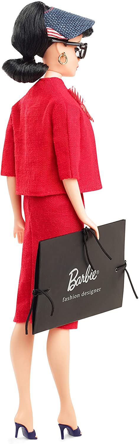 This nostalgic reproduction of Barbie Busy Gal doll is sure to delight fans and collectors alike. Based on an iconic design that debuted in 1960, the reproduction of Barbie Busy Gal fashion designer doll features a classic look to accompany her vintage face sculpt. She wears a red skirt and jacket over a crisp, red and white pin-striped blouse bodysuit. This Busy Gal doll carries a portfolio accessory, complete with two fashion sketches, and prepares to take on the big city in this smart, tailored look. Finishing touches replicated from the original Barbie doll include a navy-blue woven hat, woven belt, navy slides and black, cat-eye framed glasses. Gold Label collection. Subject to availability. Colors and decorations may vary.