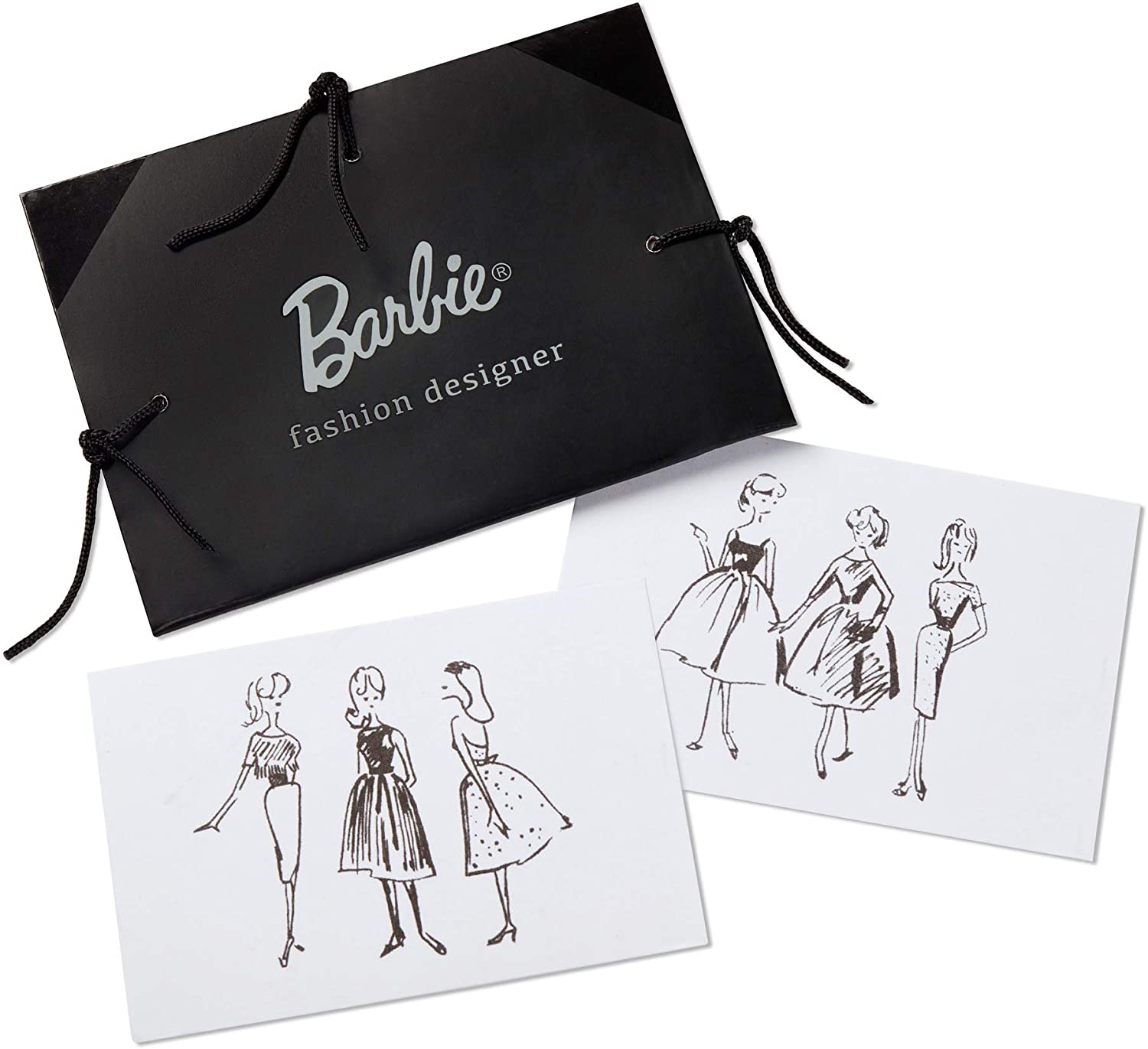 - Accessories include golden hoop earrings and Barbie doll's portfolio with two fashion sketches tucked inside.
