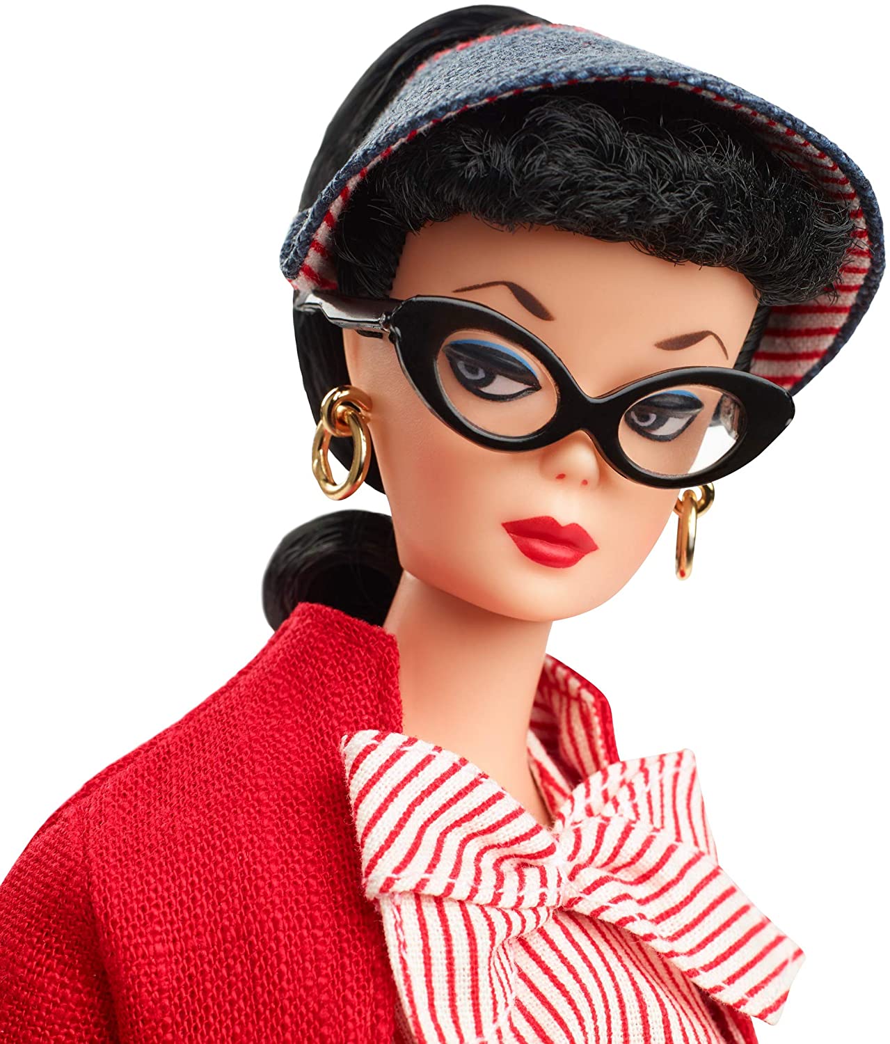 - Details replicated from the original Barbie doll include a navy-blue woven hat and cat-eye framed glasses.