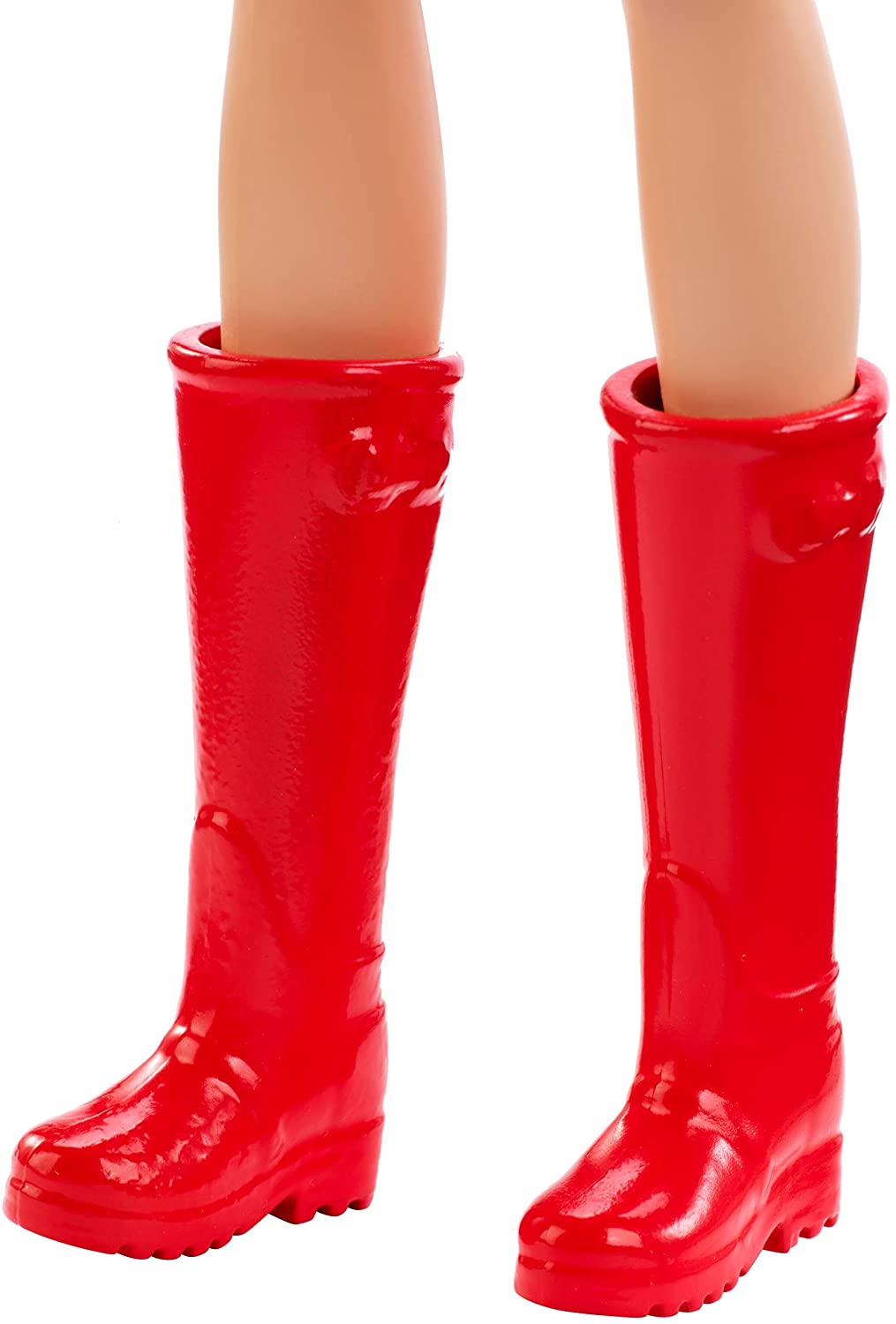 - Barbie doll is dressed in a pink t-shirt with farm graphic, denim shorts and red boots.