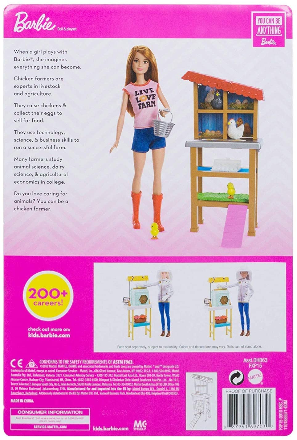 Barbie career dolls and toys inspire kids to dream big and aim high! These Barbie playsets turn the workspace into a play space with job-related furniture and accessories that let young professionals explore their dream aspirations. Each doll and playset has lots of pieces, with signature Barbie style, for lots of learning and playing opportunities. The chicken farmer doll raises fun with a henhouse for her three chickens and two chicks; a basket and egg tray are additional ingredients for storytelling recipes. Barbie chicken farmer doll has a bent elbow to allow her to hold the pail or carry a chicken. She inspires young animal lovers in a casually professional outfit with "live love farm" graphic on her t-shirt and tall red boots. Kids will love the opportunity to try on different career hats and explore their dreams. Pick one profession or try them all because when a girl plays with Barbie, she imagines everything she can become (each sold separately, subject to availability). Includes Barbie doll, a chicken coop with ramp, three chickens, two chicks, one basket and a tray of eggs. Barbie doll cannot stand alone. Colors and decorations may vary.