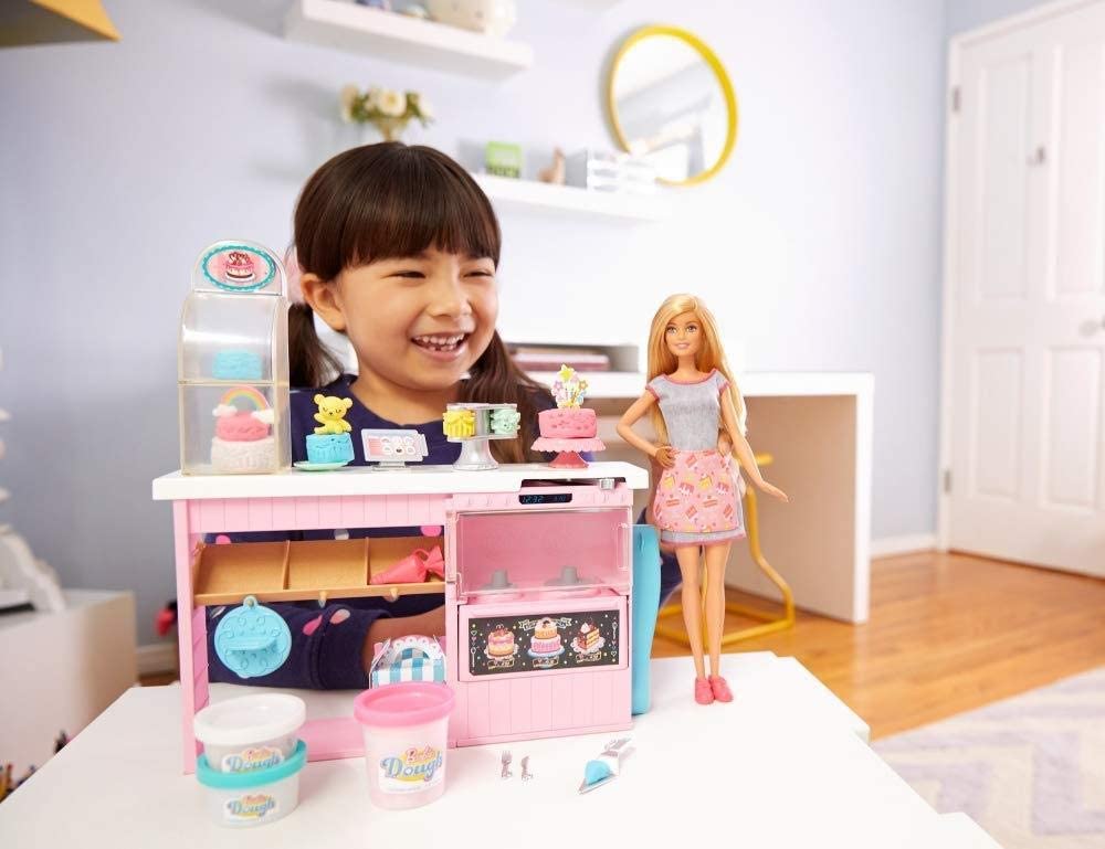 • "​barbie baker doll comes with a sweet playset that lets kids "bake," decorate and display cakes using barbie dough and fun working features!"